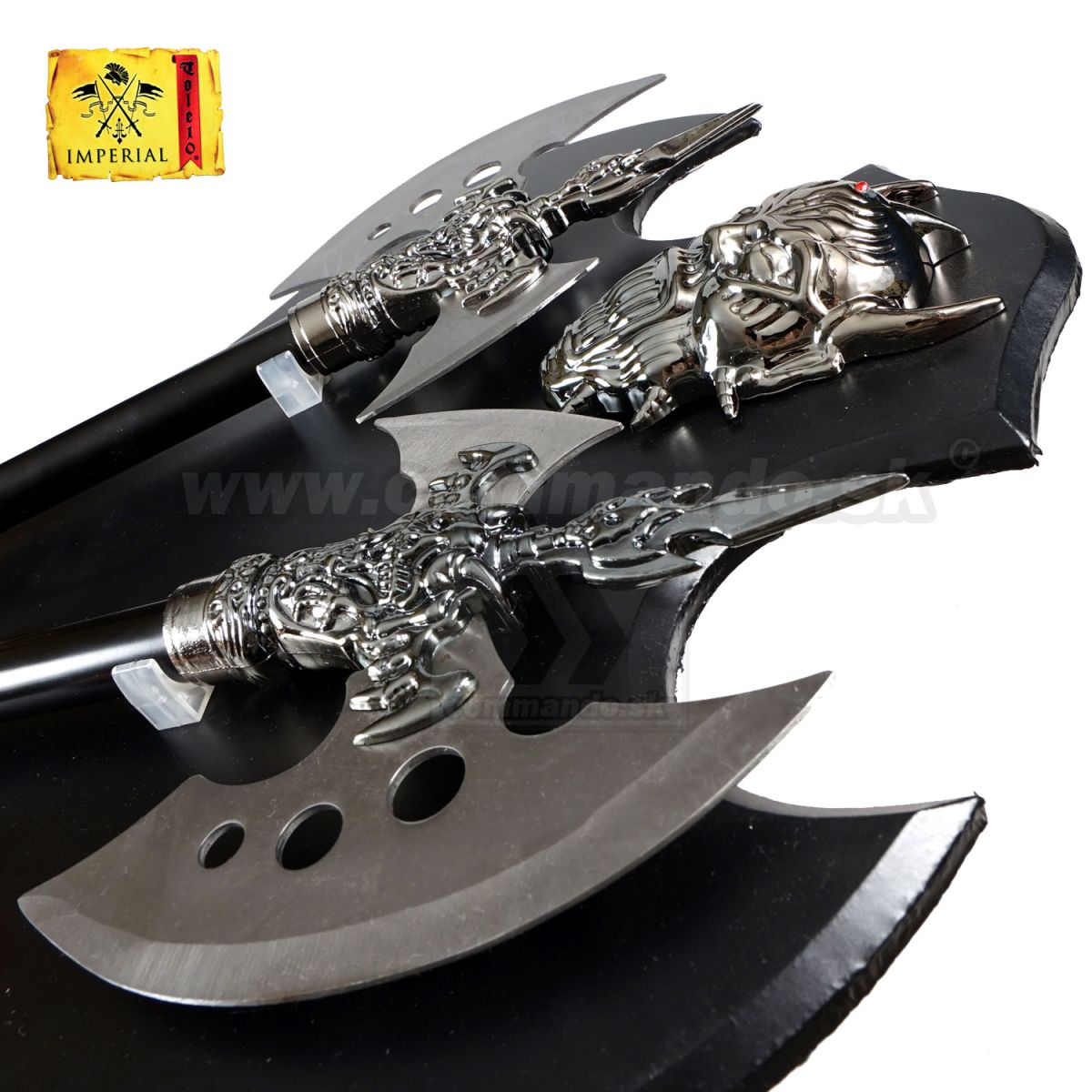 Na drevenom podklade sú štyri plastové klipy, do ktorých sa zacvaknú sekerky. Na vrchole podkladovej dosky je  hlava "devil" v hematitovej farbe. Dĺžka jednej sekerky je takmer pol metra. Je vyrobená z kombinácie kovu a plastu. Drevený podklad ma v strede predpripravenú malú dierku na zavesenie na stenu.