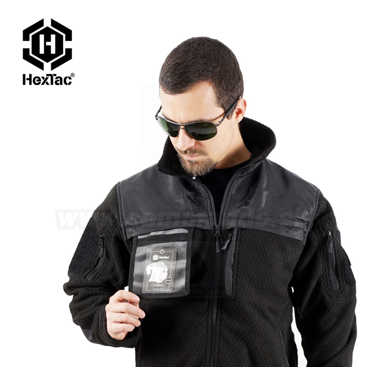 Výborný materiál, už na prvý pohľad je jasné, že sa jedná o veľmi dobrý produkt. Hexagonový vzor  je použitý na celej mikine, vrátane zosílenej časti na vrchu chrbáta, lakťovej časti a lemovania okolo pásu. Golier môže byť stojáčik, alebo klasika na ležato, podľa potreby. Všetky vrecká sú zipsovacie. Všetko viď. foto. Na rukávoch sú velcro panely, čiže podklady na suché zipsy. Bunda sa dá vytuningovať nejakou 3D nášivkou. Na zápästi rukávov je sťahovací systém, taktiež pomocou suchého zipsu. Moderný vzhľad flisovej mikiny nezaprie svoje kvality.