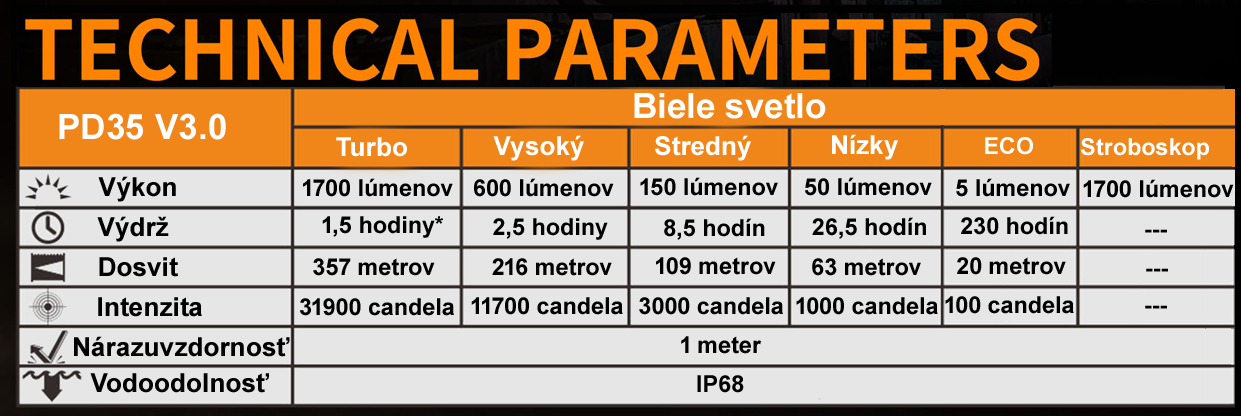 Vyššie uvedené špecifikácie sú výsledky testov podľa normy ANSY/PLATO FL1 v spoločnosti Fenix prostredníctvom laboratórneho testovania s použitím nabíjateľnej Li-ion batérie Fenix ARB-L21-2600U pri teplote 21°C a vlhkosti 50% - 80%. Skutočný výkon tohto produktu sa môže líšiť v závislosti od rôznych podmienok prostredia a aktuálne použitých batérií.