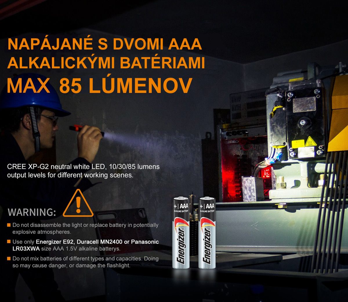 • používa dve mikrotužkové (AAA) batérie. Výrobca dôrazne odporúča používať iba tieto typy batérií, ktoré boli pre použitie vo svietidle certifikované: Energizer E92, Duracell MN2400 a Panasonic LR03XWA