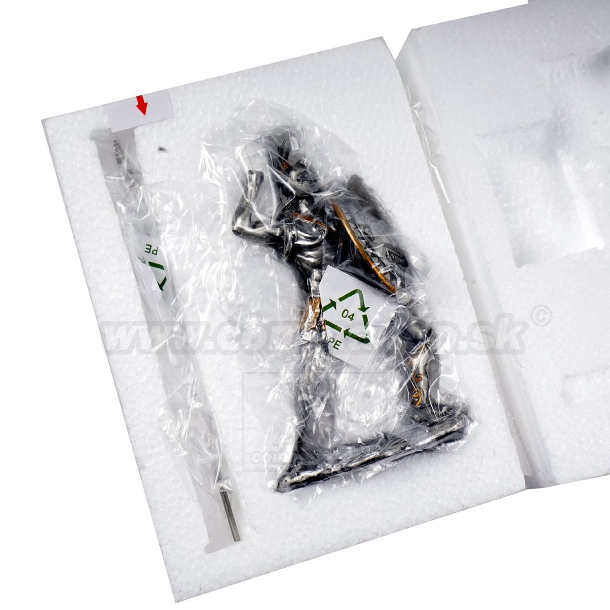 POZOR: pri vyberaní sošky z krabice treba dávať maximálny zreteľ na opatrnosť. Netreba ťahať za slabé, chúlostivé časti, ako sú meče, oštepy, hlavu krídla a podobne. Je nutné vždy ťahať za podstavec, resp. na miestach kde ukazuje šípka v balení.