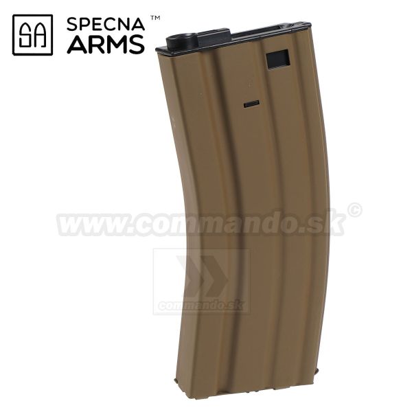 Celokovový HiCap zásobník pod značkou Specna Arms v pieskovej farbe.