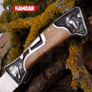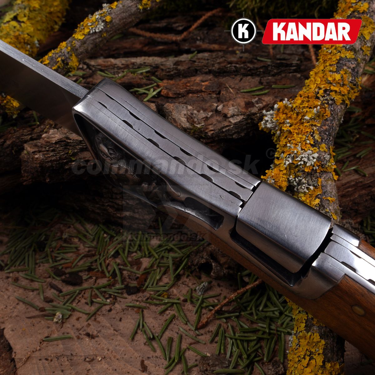 Robustný zatvárací nôž strednej veľkosti Kandar Hunter Old Bear je určený pre všetkých, nielen pre poľovníkov. Nôž je pomerne ťažký, preto pôsobí hodnoverným dojmom. Špeciálna poistka na chrbáte noža sa uvoľňuje stlačením. Efektné sú taktiež reliéfy na rúčke. Rúčka je kombinovaná aj s pravým drevom, preto môže odtieť dreva sa líšiť, predsa ide o prírodný materiál. Nôž, napriek tomu že má ozdobné prvky, je určený pre denno denné používanie.