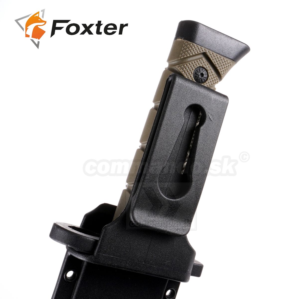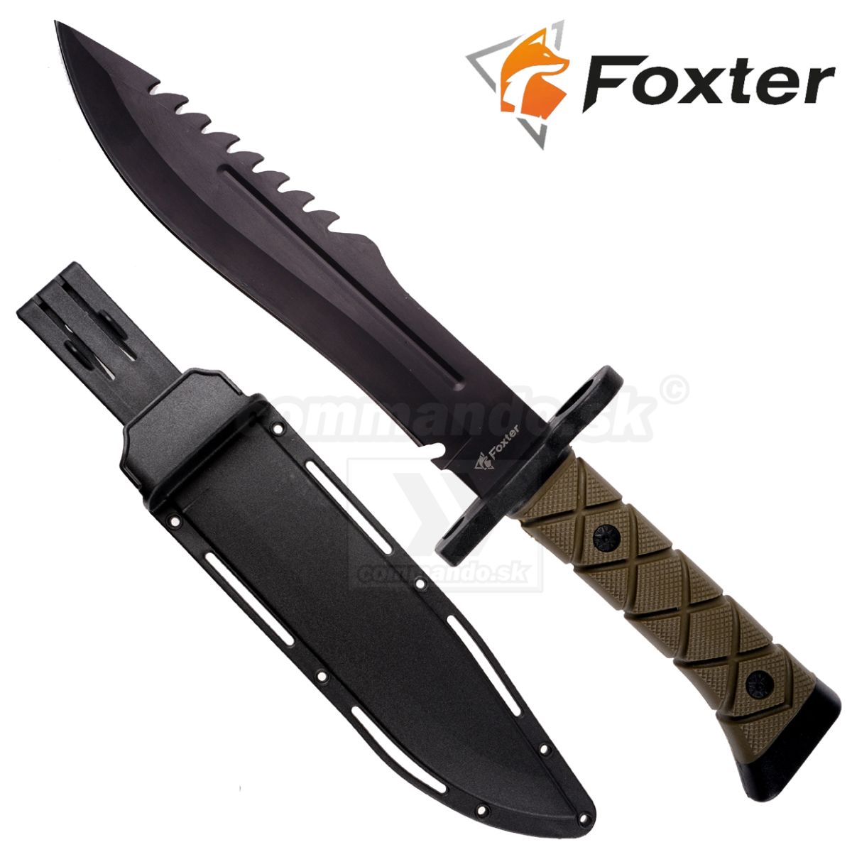 Vojenský taktický lovecký nôž s bajonetovým dizajnom s dĺžkou 34 cm. Nôž s pevnou čepeľou vyrobený z odolnej oxidovanej ocele, ktorá mu dodáva vojenský charakter. Čepeľ je úplne hladká, v hornej časti čepele je žraločia pílka. Nôž možno použiť pri kempovaní, práci v lese alebo pri domácich prácach. Anatomický tvarovaná rukoväť s pritišmykovými vlastnosťami. Nôž je dodávaný s funkčným puzdrom vyrobeným z polyméru. Puzdro sa dá zavesiť na opasok, na batoh, alebo podľa vlastného uváženia.