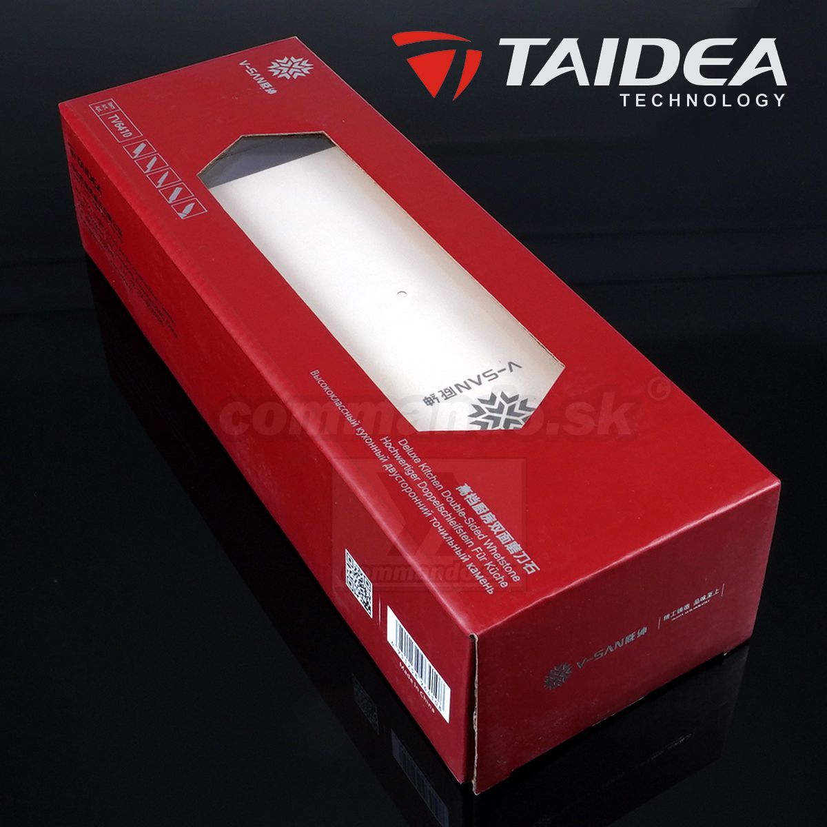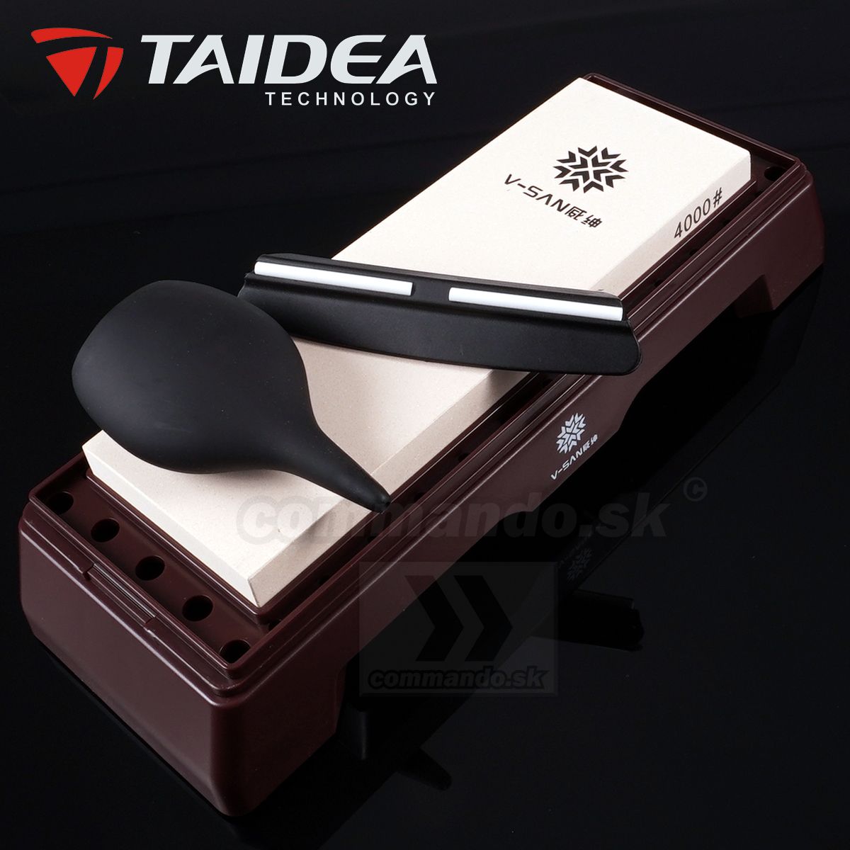 Kombinovaný brúsny kameň Taidea V-SAN so zrnitosťami 1000 a 4000 na brúsenie a leštenie ostria. Zrnitosť 1000 je určená na záverečnú jemnú fázu brúsenia. Zrnitosť 4000 zabezpečí dokonalé vyleštenie ostria. Kameň je vyrobený z korundu (oxid hlinitý) a pred brúsením je odporúčané namočiť kameň do vody aspoň na 10 minút. Používa sa na brúsenie s vodou, použitie oleja ani suché brúsenie sa veľmi neodporúča. Kameň je vhodný na brúsenie nožov, kuchynských nožov, rezbárskych nástrojov, ale aj sekier.