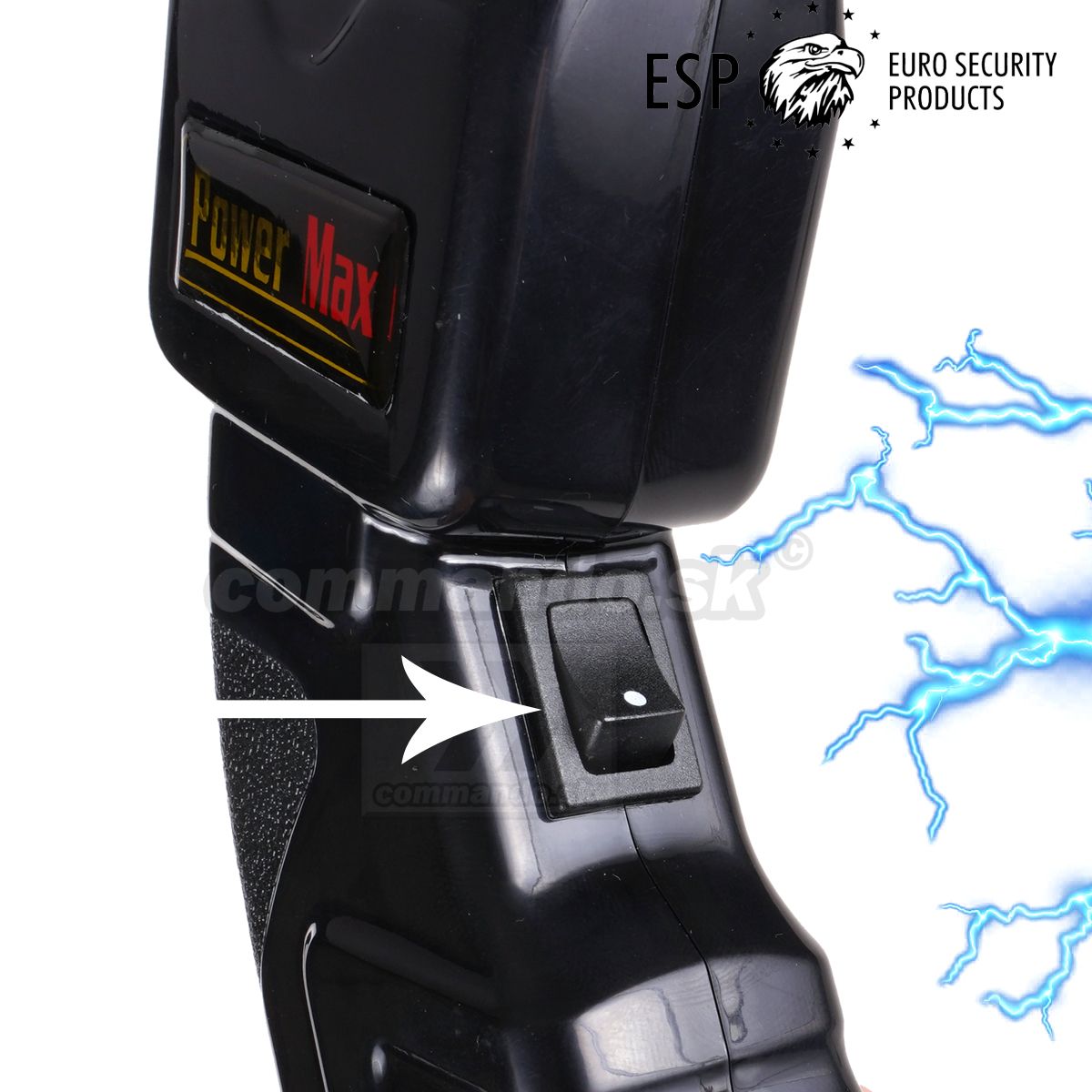Napájací zdroj pre model POWER Max tvorený dvoma batériami 9Va preto má vysoký výkon. Jednou z najdôležitejších predností paralyzéra POWER Max je putko na ruku s bezpečnostnou zátkou. Tento remienok na ruku visí na zápästí a znefunkční paralyzér v momente, keď je zariadenie násilne vytiahnuté z ruky. Proti neúmyselnému vybitiu vás bráni bezpečnostný spínač.