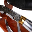 Vyobrazený stojan nie je súčasťou balenia. Súčasťou noža sú aj dva malé nožíky, jeden je pracovný a druhý slúži ako ocieľka. Puzdro je kožené so širokým pútkom.
