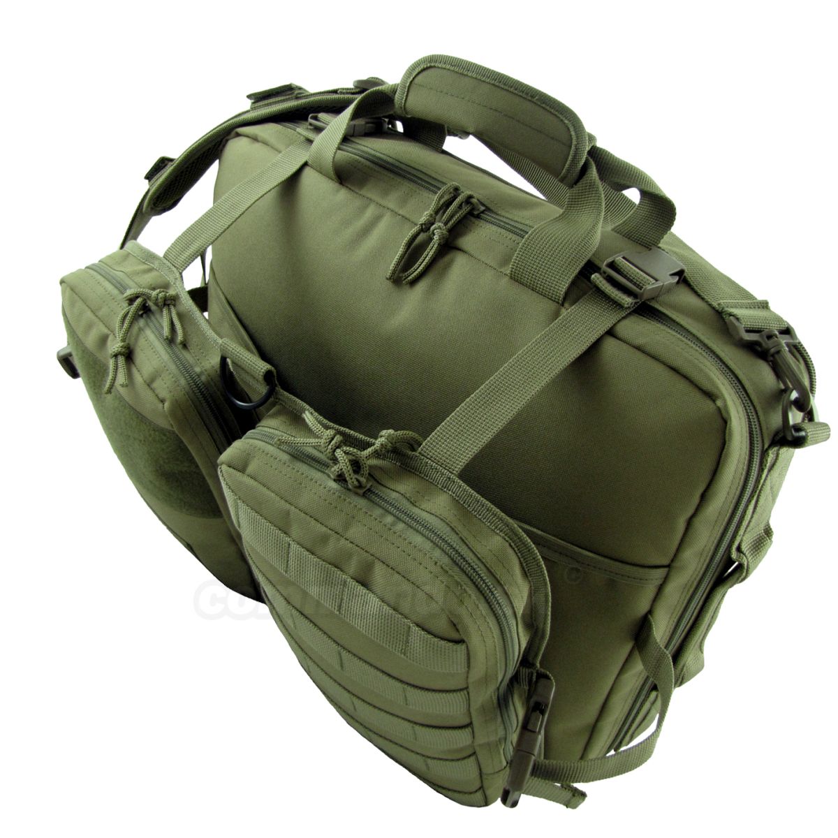 Taška má predný zdvíhací panel, ktorý je držaný na mieste so 4 prackami. Na prednej strane sú dve priestranné organizačné vrecká zapínané na dvojcestný zips. Jedno vrecko s identifikačným okienkom a suchým zipsom na všetky druhy nášiviek, vlajok, krvných skupín a pod. Druhé vrecko je lemované 5 radmi montážnych pások, ktoré umožňujú ďalšie rozšírenie tašky. Medzi hlavnou priehradkou a panelom je vrecko na zips a veľká priehradka.