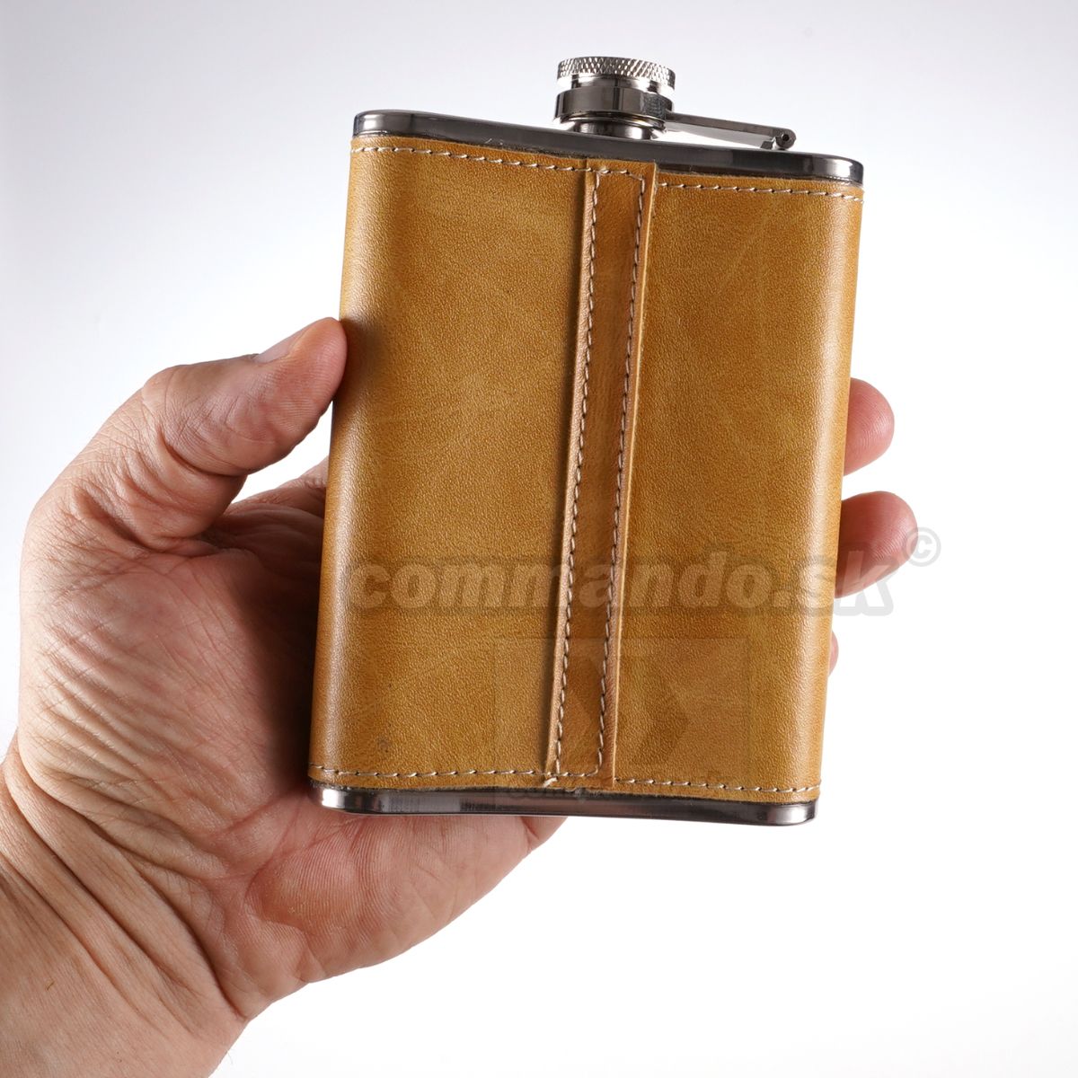 Výrobok je komplet z nerezu s objemom 8Oz, čo je v prepočte na našu mierku cca. 0,236 litra.  Nerezový povrch je potiahnutý koženkovou vrstvou. Koženka nie je vhodná do umývačky, ani na bežné umývanie. Na druhej strane slúži čiastočne ako izolácia. A keďže náplň je zväčša alkohol, ten sa nikdy nepokazí, a tým pádom netreba vnútro v podstate umývať, len pred prvým pousžitím sampzrejme.