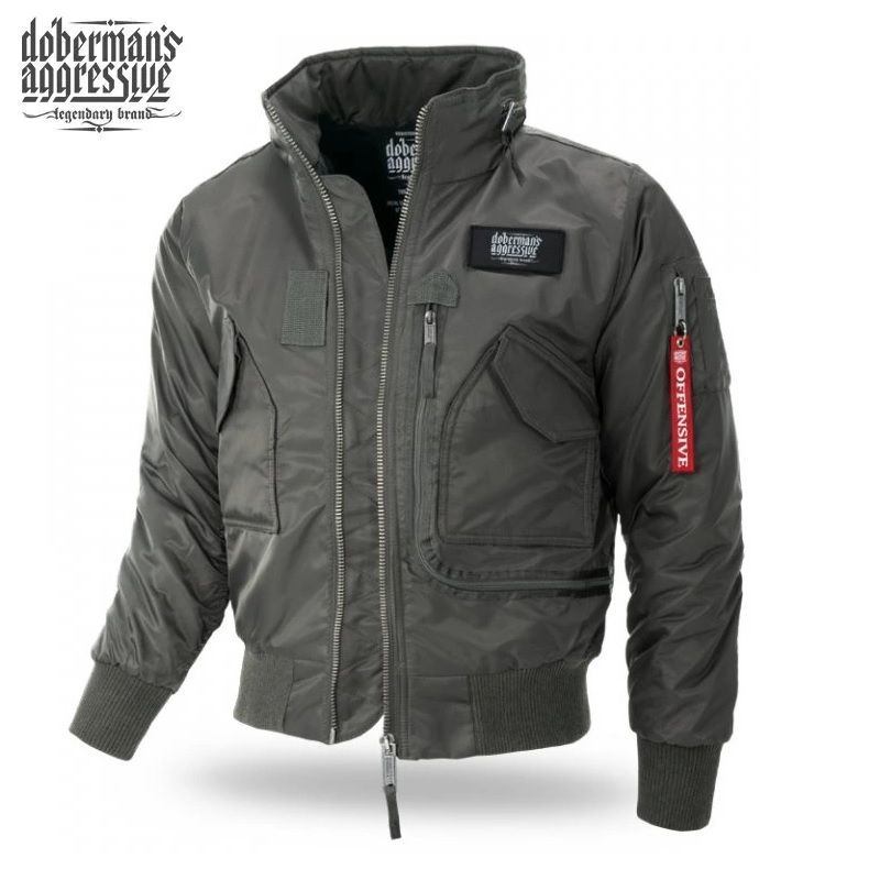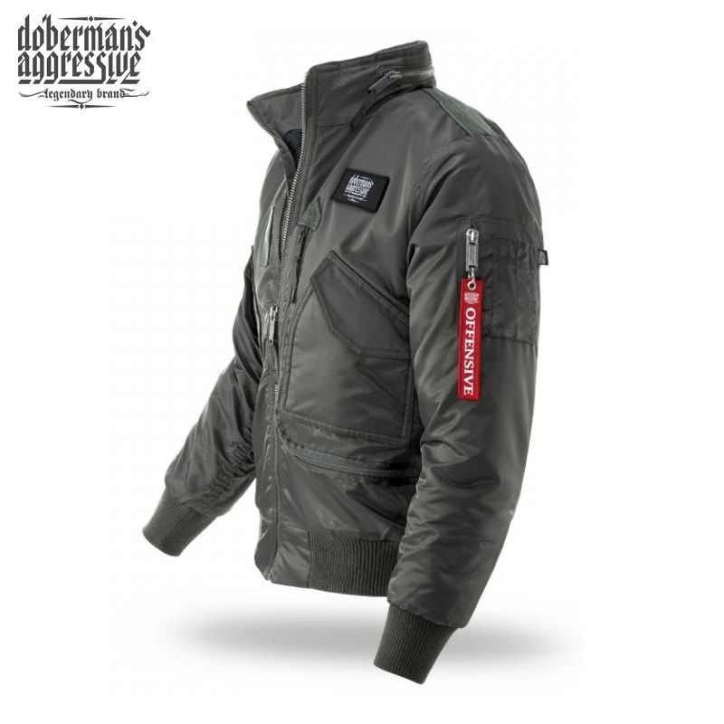 Bunda v bomber strihu so stojačikom sa zapína na zips. Na ľavom rukáve je vrecko na zips a červený štítok OFFENSIVE. Disponuje veľkým vreckom so zapínaním na zips v prednej časti bundy a dvoma menšími vreckami so zapínaním na suchý zips. Na hrudi je vyšívaná nášivka na suchý zips s logom Dobermans Aggressive. Na rukávoch a leme má elastický rebrovaný lem.