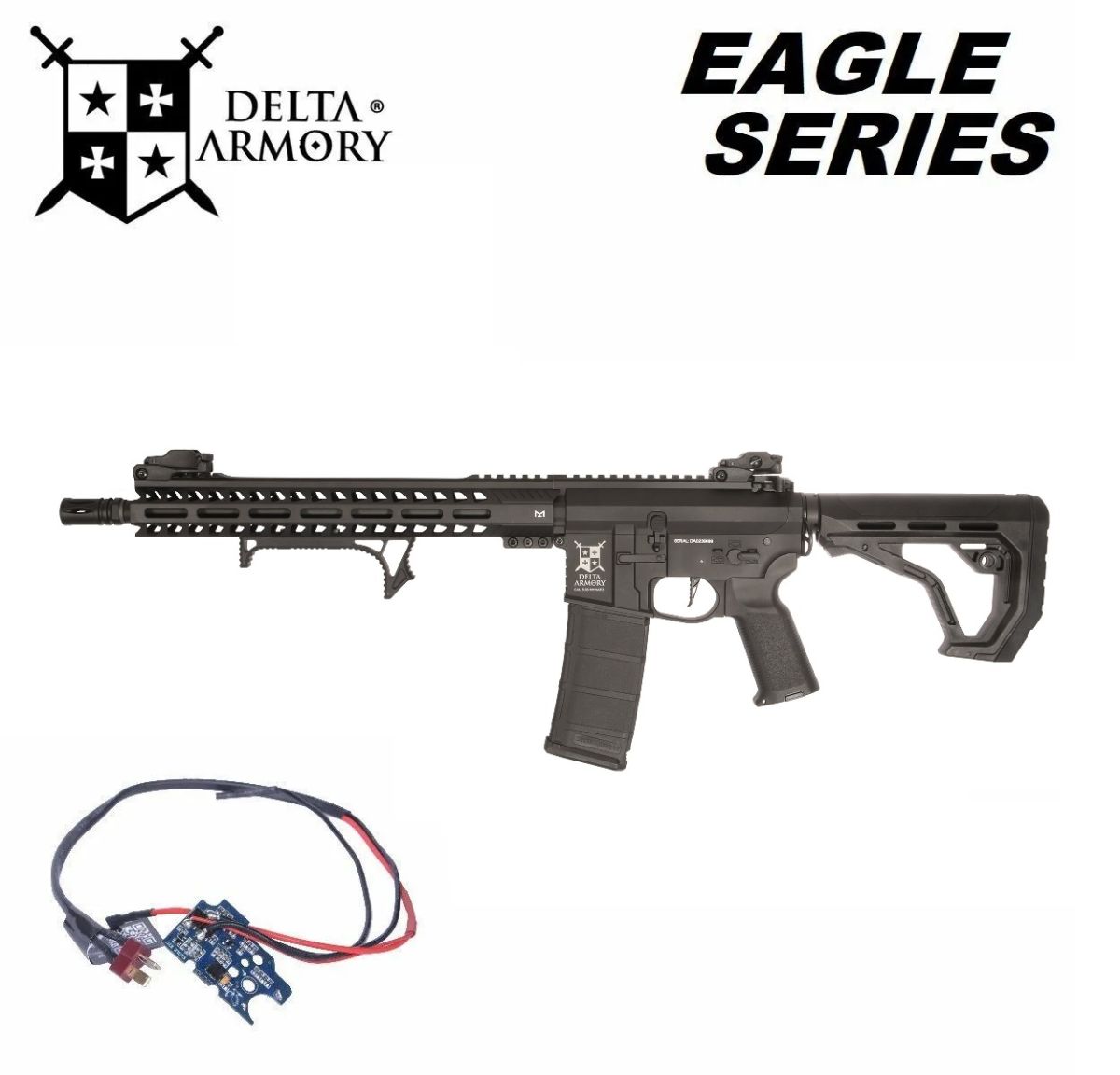 Eagle séria je najnovším prírastkom do ponuky od renomovanej značky Delta Armory. Eagle séria reaguje na narastajúci dopyt po elektronických spúšťach priamo v zbraniach, ktoré pomaly nahrádzajú klasické mechanické spúštové kontakty. Eagle séria prináša novú ETU opticko-magnetickú procesorovú jednotku, ktorá zabezpečí rýchlu odozvu spúšte a zároveň je zbraň pripravená na použitie s 11,1 LiPo batériami. (Batéria sa vkladá do tubusu pažby, konkrétne odporúčame Delta Armory 11,1V/1100mAh). Samozrejmosťou je Deans-T konektor, ktorý nahradil klasický Tamiya konektor.