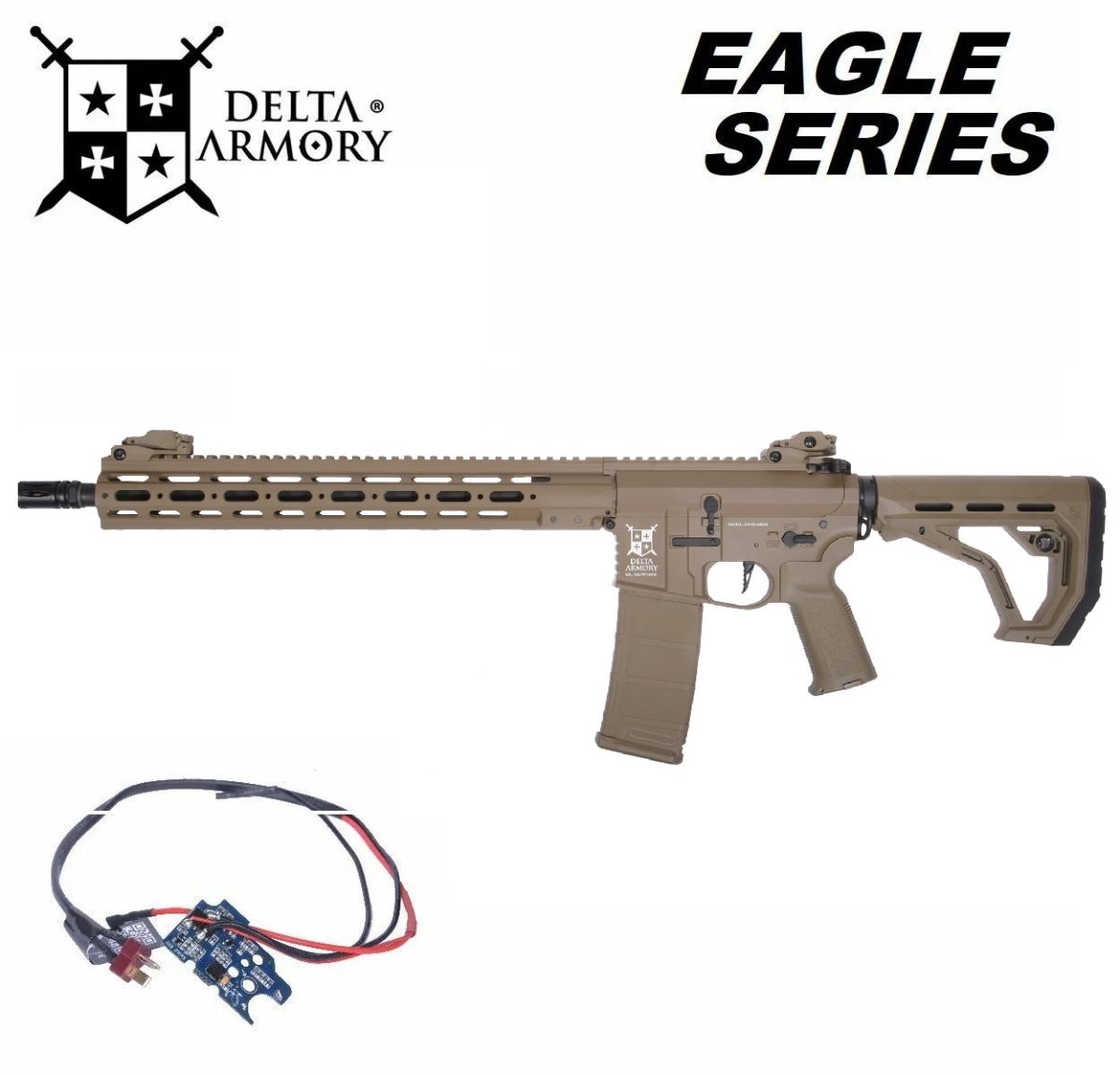 Eagle séria je najnovším prírastkom do ponuky od renomovanej značky Delta Armory. Eagle séria reaguje na narastajúci dopyt po elektronických spúšťach priamo v zbraniach, ktoré pomaly nahrádzajú klasické mechanické spúštové kontakty. Eagle séria prináša novú ETU opticko-magnetickú procesorovú jednotku, ktorá zabezpečí rýchlu odozvu spúšte a zároveň je zbraň pripravená na použitie s 11,1 LiPo batériami. (Batéria sa vkladá do tubusu pažby, konkrétne odporúčame Delta Armory 11,1V/1100mAh). Samozrejmosťou je Deans-T konektor, ktorý nahradil klasický Tamiya konektor.