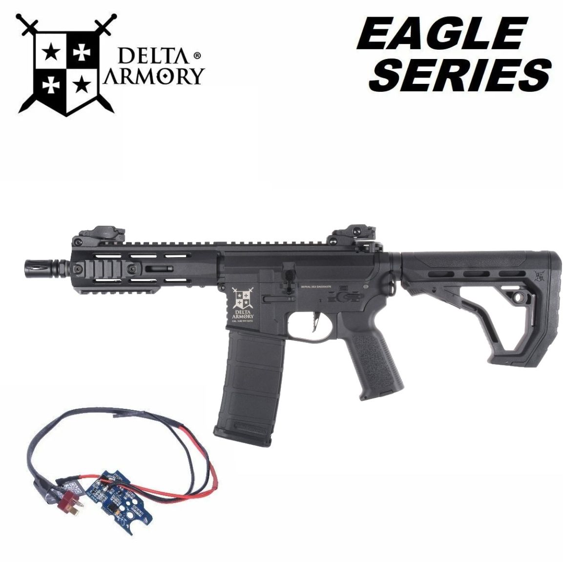 Delta Armory Eagle séria prináša najnovšie technológie do sveta airsoftu! Odpovedá na rastúci dopyt po elektronických spúšťach, ktoré nahrádzajú zastarané mechanické kontakty. Tento model je vybavený revolučnou ETU procesorovou jednotkou, ktorá zaisťuje okamžitú odozvu spúšte a je plne kompatibilná s 11,1V LiPo batériami.