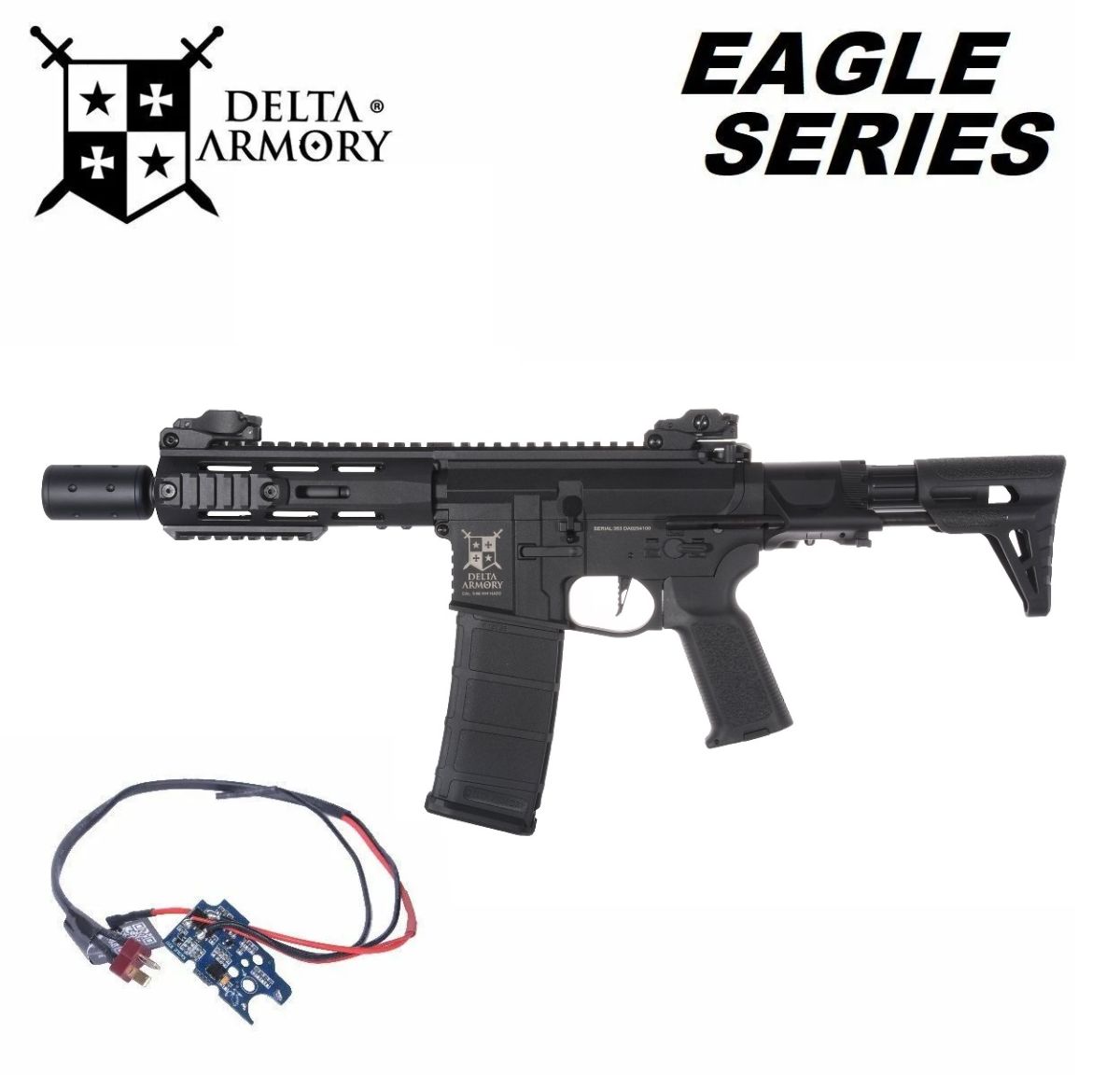 Delta Armory Eagle séria prináša najnovšie technológie do sveta airsoftu! Odpovedá narastúci dopyt po elektronických spúšťach, ktoré nahrádzajú zastarané mechanické kontakty. Tento model je vybavený revolučnou ETU procesorovou jednotkou, ktorá zaisťuje okamžitú odozvu spúšte a je plne kompatibilná s 11,1V LiPo batériami.