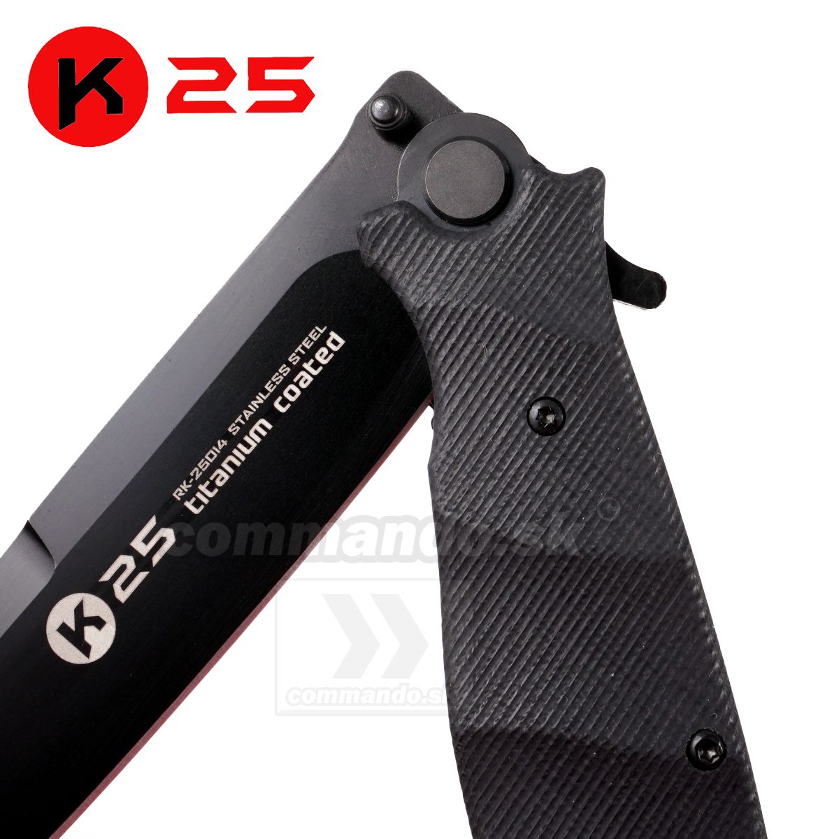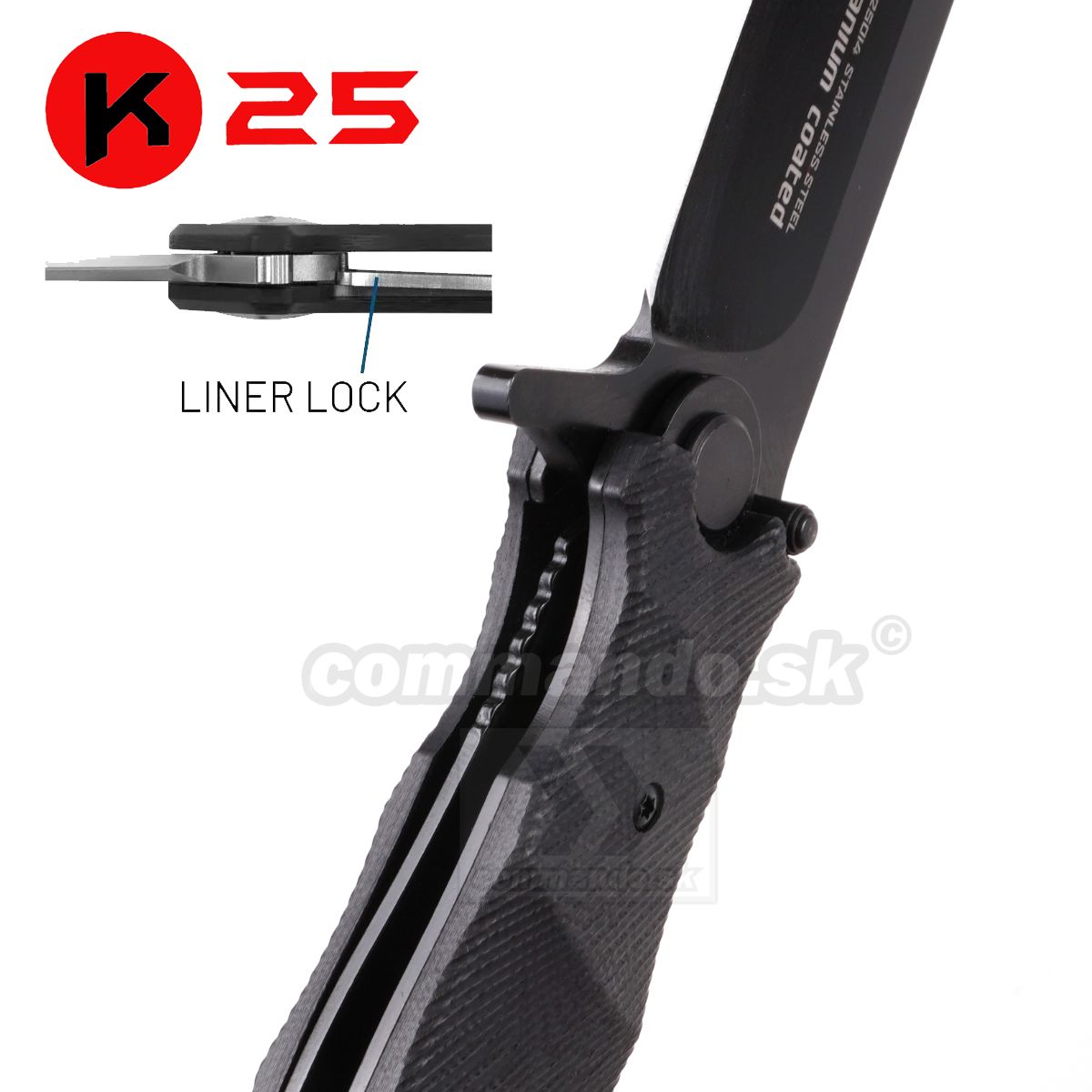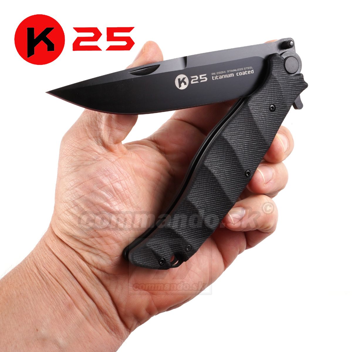 K25 značka, ktorá ponúka výbornú kvalitu v tejto cenovej hladine. Obrábanie pomocou CNC technológie, rúčka obložená kompozitom G10 v čiernej farbe. Otváranie a zatváranie noža je ľahké a plynulé, otvorenie pomocu jedného prsta. Funkčné MOLLE čierné nylonové puzdro je súčaťou balenia. Puzdro sa zapína pomocou malej pracky a dodatočné istené suchým zipsom. V otvorenej polohe je nož fixovaný poistkou Liner Lock. Čepeľ je potiahnutá titánovou vrstvou - Titanium Coated.