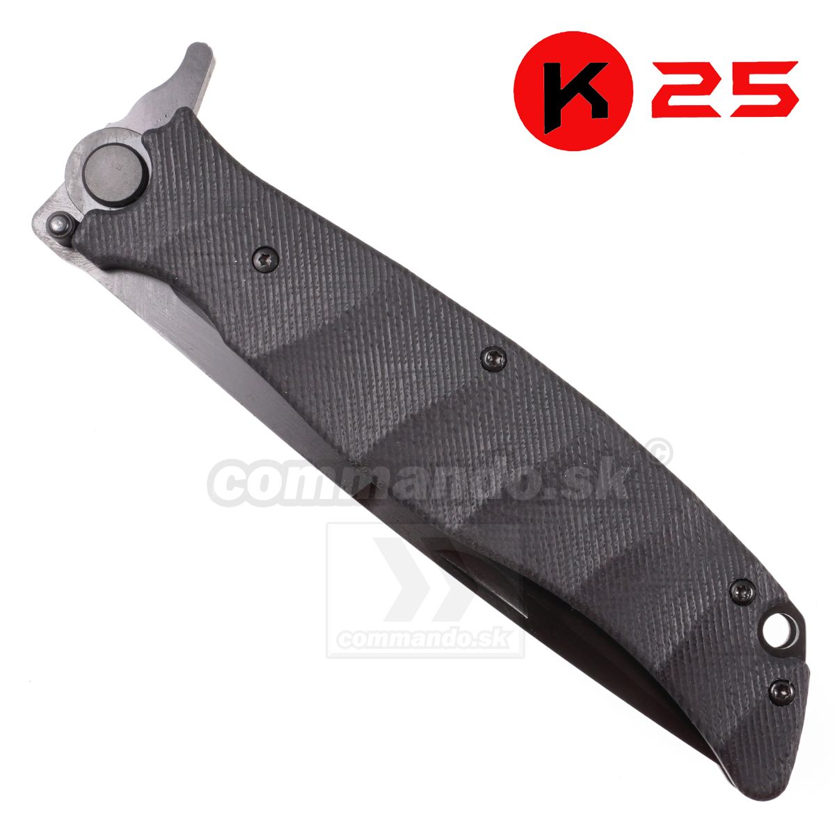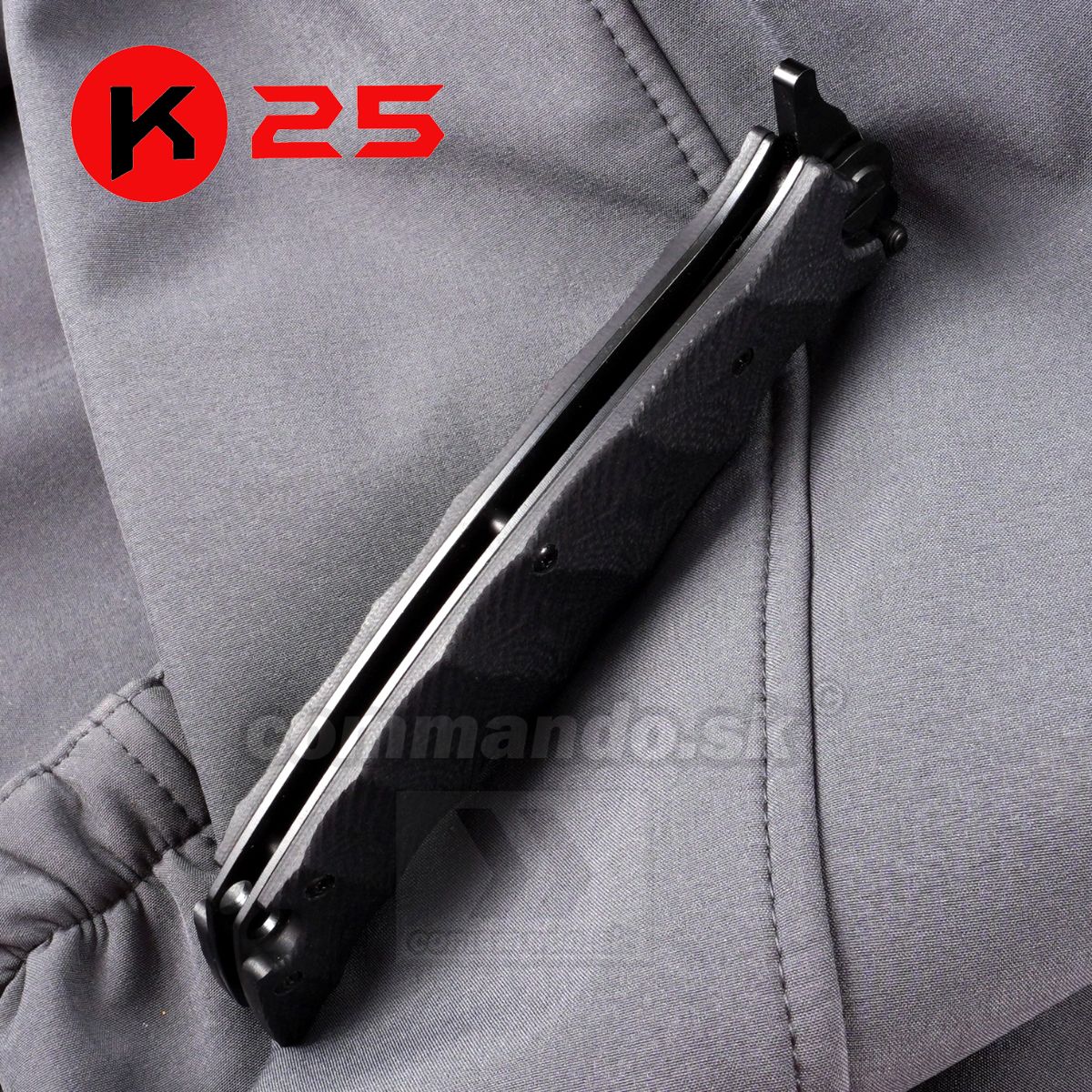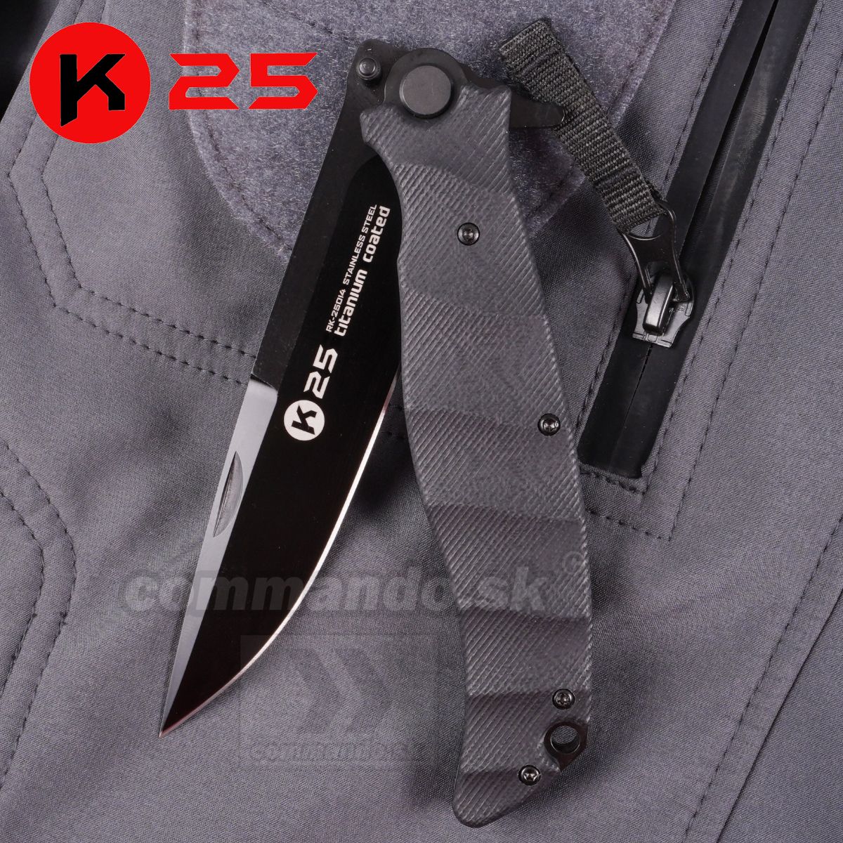 K25 značka, ktorá ponúka výbornú kvalitu v tejto cenovej hladine. Obrábanie pomocou CNC technológie, rúčka obložená kompozitom G10 v čiernej farbe. Otváranie a zatváranie noža je ľahké a plynulé, otvorenie pomocu jedného prsta. Funkčné MOLLE čierné nylonové puzdro je súčaťou balenia. Puzdro sa zapína pomocou malej pracky a dodatočné istené suchým zipsom. V otvorenej polohe je nož fixovaný poistkou Liner Lock. Čepeľ je potiahnutá titánovou vrstvou - Titanium Coated.