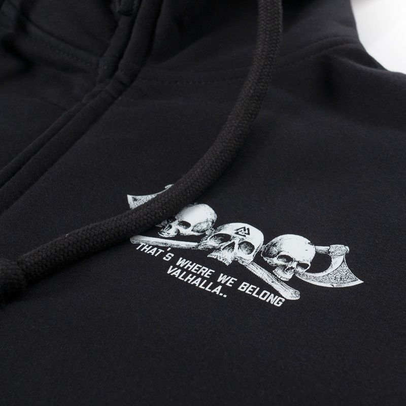 Malá etiketa s logom značky na ľavom rukáve. Kapucňa zdobená širokou šnúrkou a kovovými prvkami s logom značky. Na zadnej strane je dvojfarebná grafika s nápisom Viking Comp, tromi lebkami a sekerami a slovami „That's Where We Belong Valhalla“. Na ľavej prednej strane hrude je zmenšený obrázok grafiky, ktorá sa nachádza na zadnej strane mikiny.