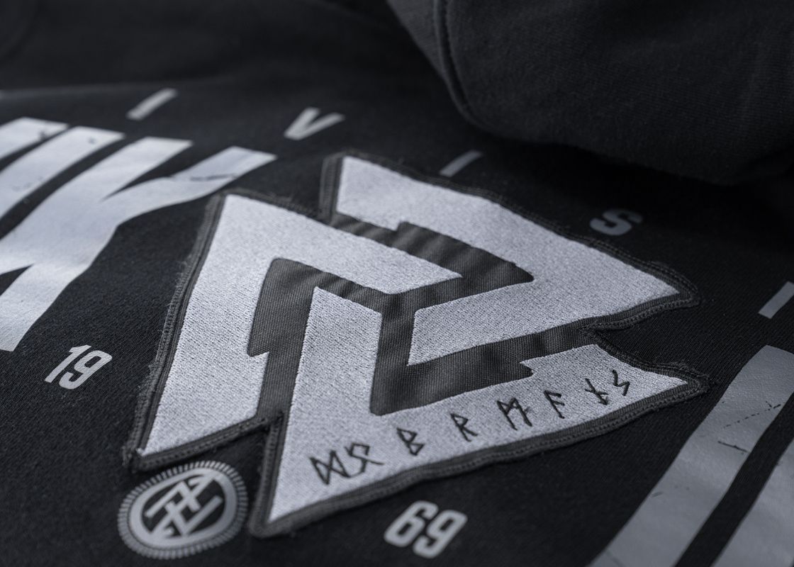 Na ľavom rukáve malý dizajn s logom značky. Spodná časť a rukávy sú zakončené širokými lemami. Mikina zo série Valknut inšpirovaná severskou symbolikou. Zadná strana mikiny je zdobená kombináciou veľkej potlače vikingskej divízie a vyšívaného symbolu Valknut. Na ľavej strane hrudníka menší vyšívaný severský symbol.