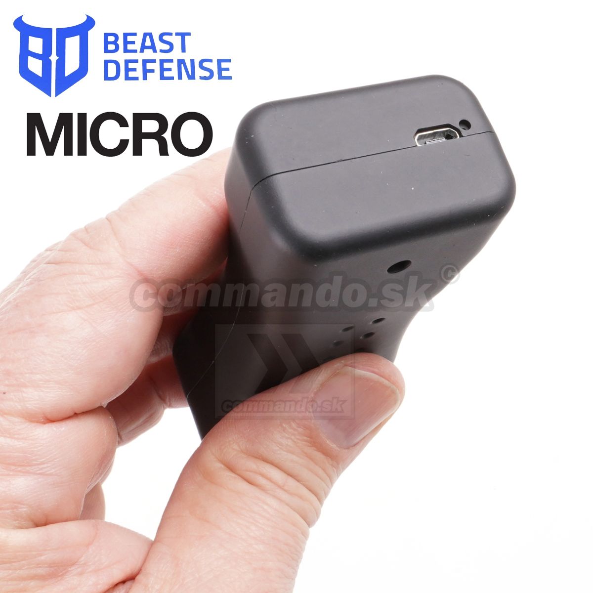 Vzhľadom k výkonu až 2,5 mil. Volt je paralyzér MICRO napájaný zabudovanou batériou. Pre vyšší komfort bola použitá nová batéria, ktorou sa docielilo hlavne zníženie celkovej hmotnosti paralyzéra a to len 75 gramov. Rovnako oceníte indikáciu stavu nabitia. V prípade, že prebieha nabíjanie, indikačná dióda svieti na červeno. Po plnom nabití Micro sa dióda zmení na zelenú. Tvarom paralyzér Beast Defense Micro je mimoriadne kompaktný. Celková dĺžka zostala len 10 cm. Pogumovaný povrch tela s ergonomickým tvarom vyhovuje do každej ruky, mimoriadne do ženskej a aj do mužskej.