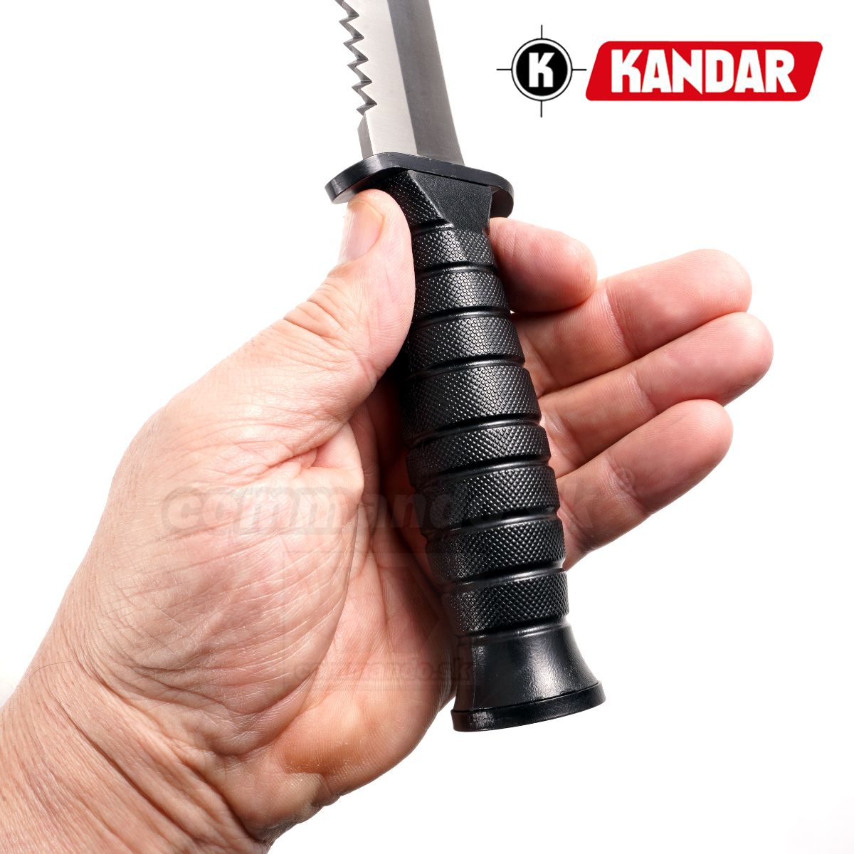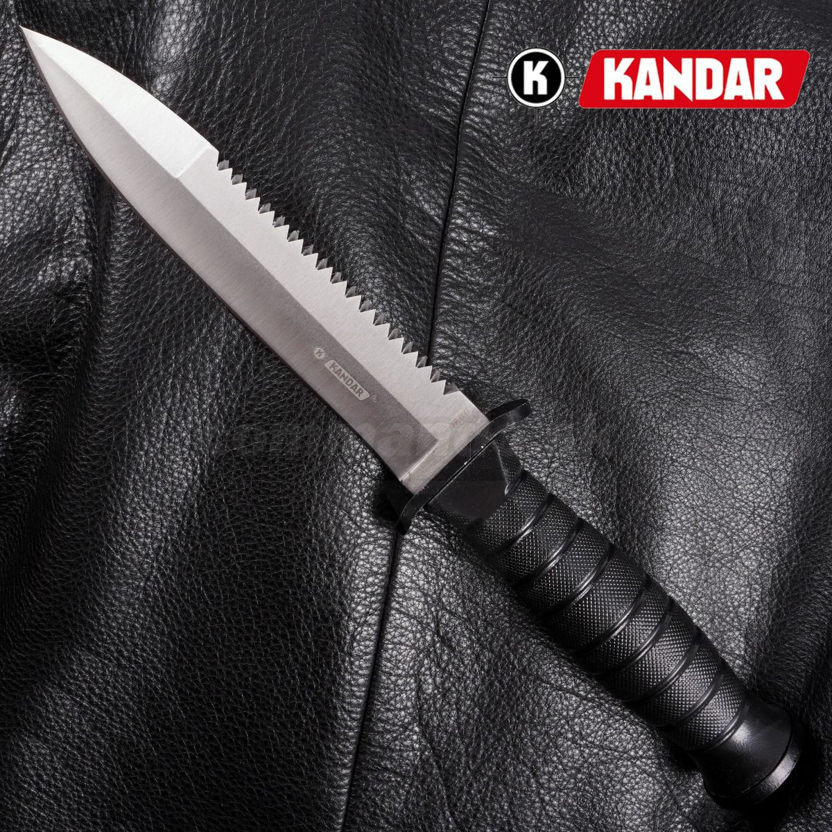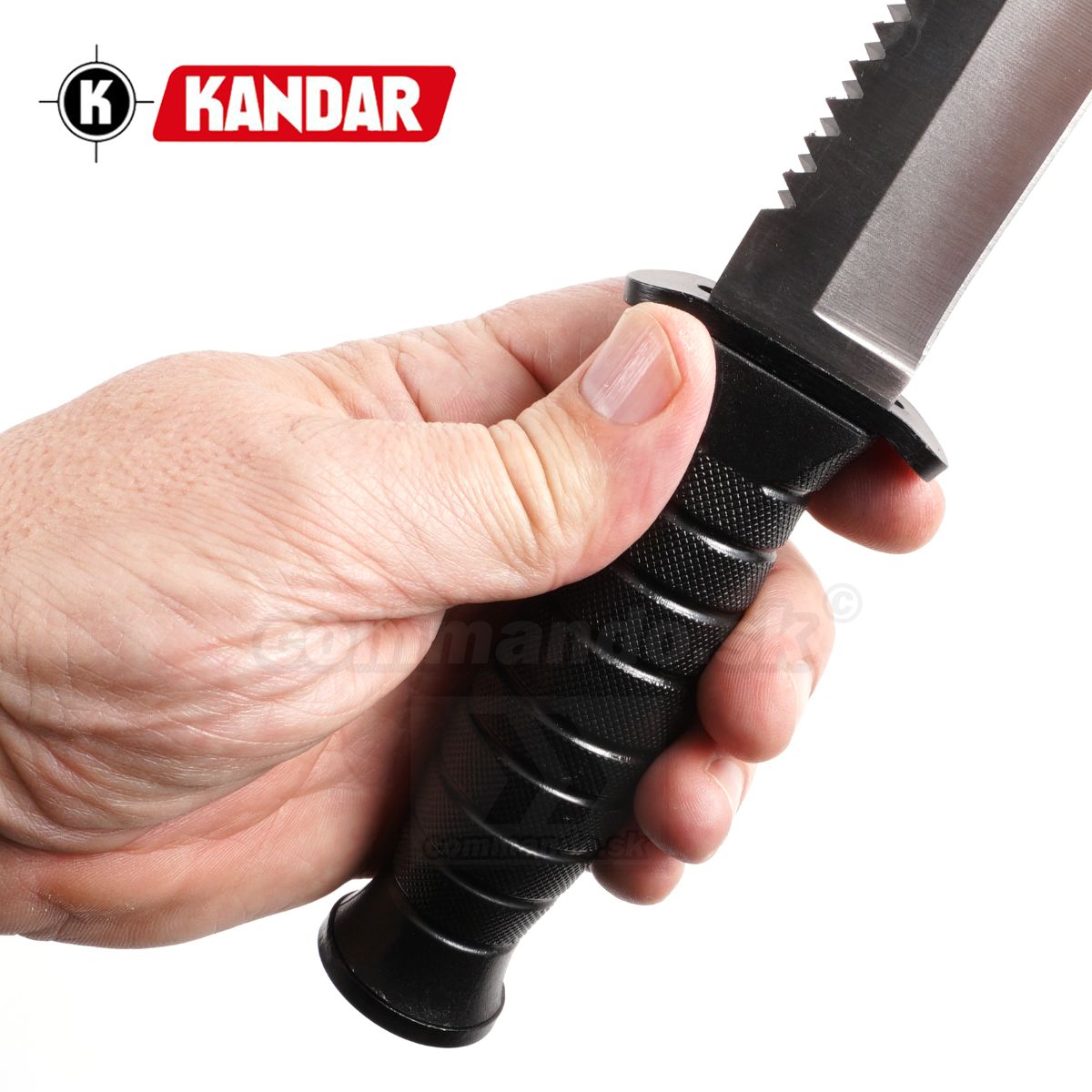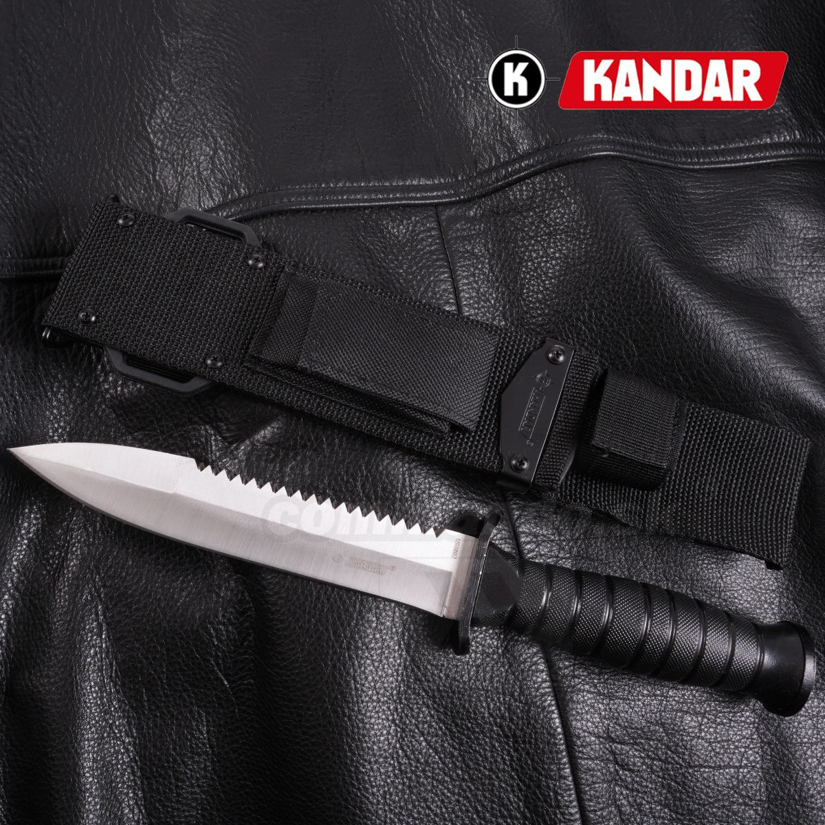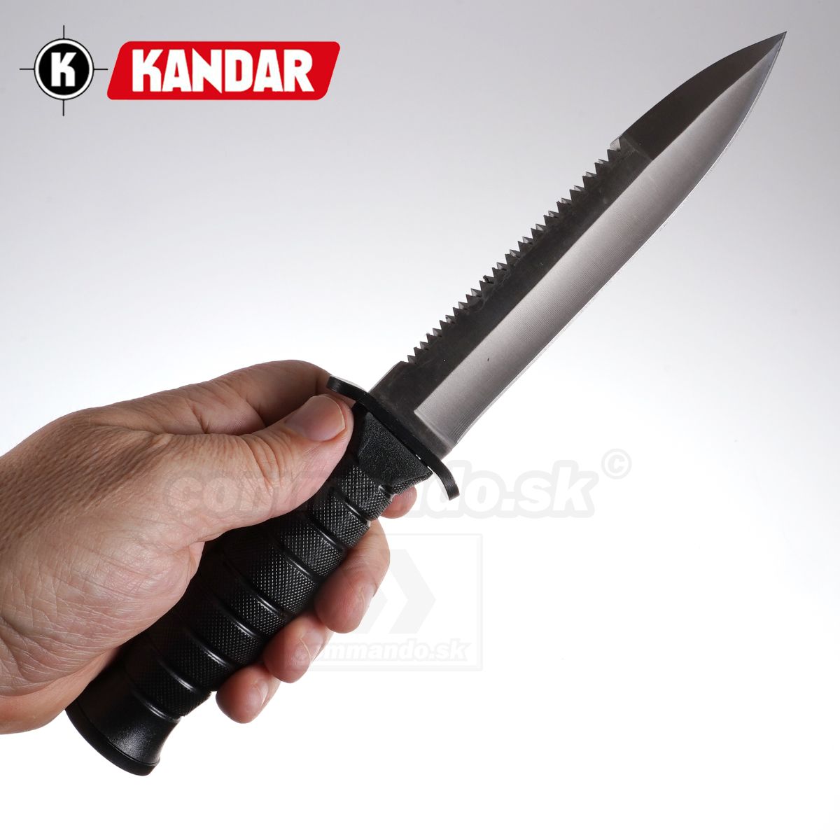 Nôž s typickým vojenským charakterom pevnou čepeľou dodávaný s nylonovým taktickým čierným puzdrom. Čepeľ typu SPEAR POINT s pílkou. Pílka dobre poslúži najmä v lese, pri rezaní menších konárov. Kovová záštita dobre chráni dlaň a prsty pred zošmyknutím na ostrie noža. Puzdro je robustné s dizajnom charakteristickým pre armádu. Súčasťou puzdra je mini brúska viď. priložené fotografie.