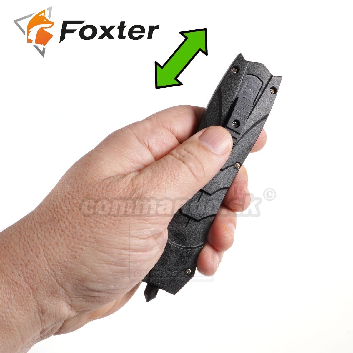 Mechanizmus vysúvania a zasúvania čepele sa aktivuje na bočnej strane rukoväte. Ak chcete čepeľ vysunúť, posuňte posúvač nahor, ak ho chcete zasunúť, jednoducho posuňte posúvač nadol. Konštrukcia noža je pevná a dobre vyvážená, čo zaisťuje pohodlie pri používaní. Na konci rukoväte je rozbíjač skla užitočný v núdzových situáciách.