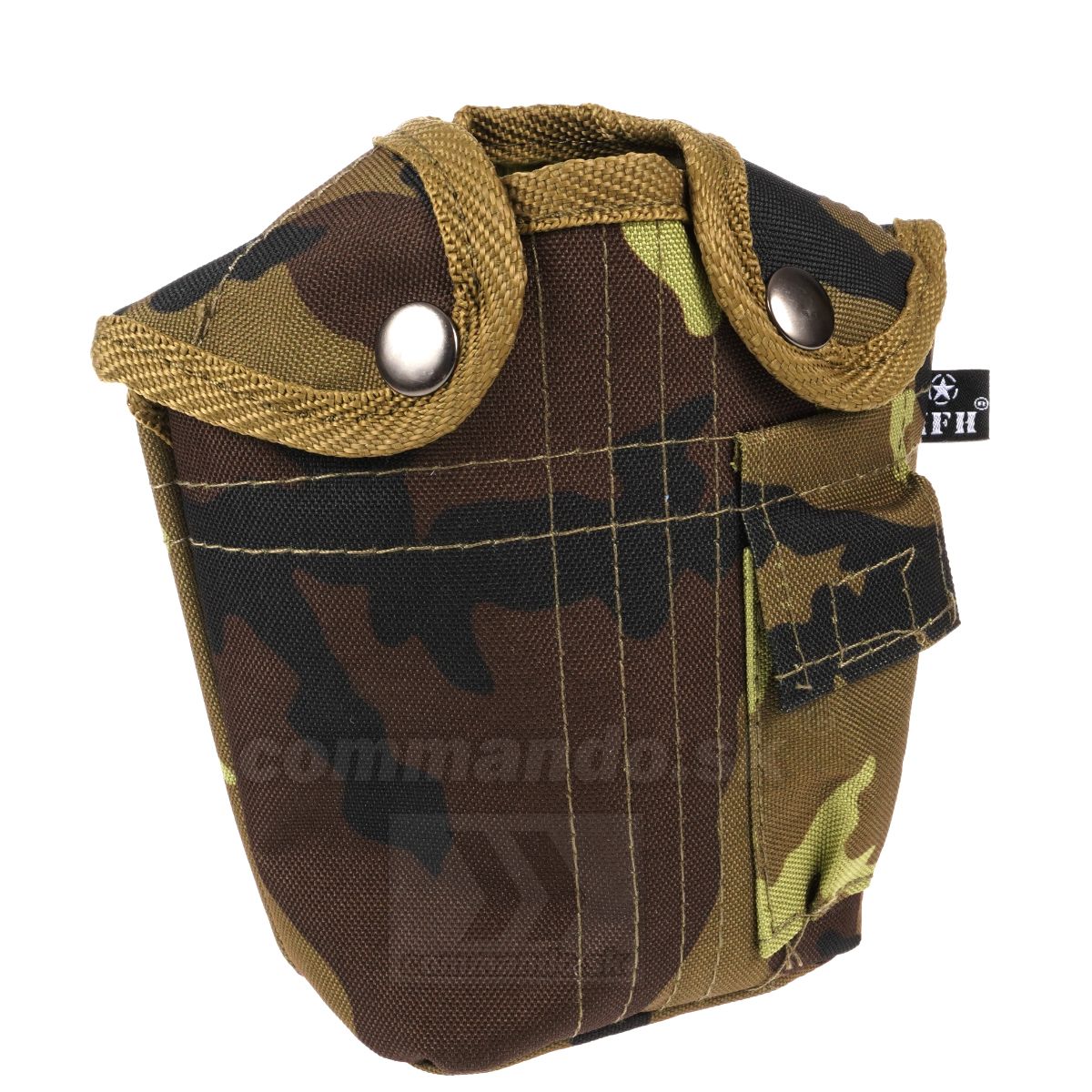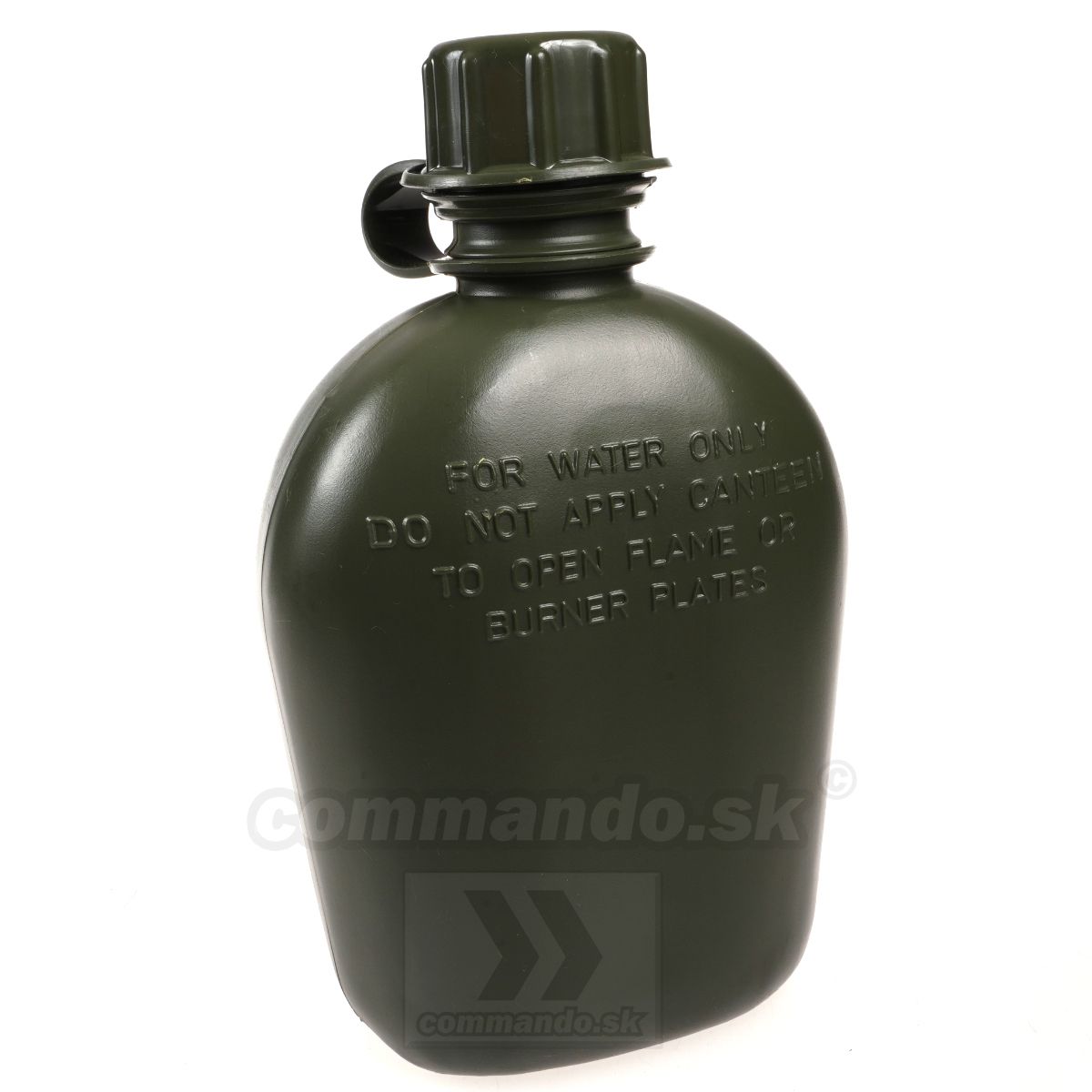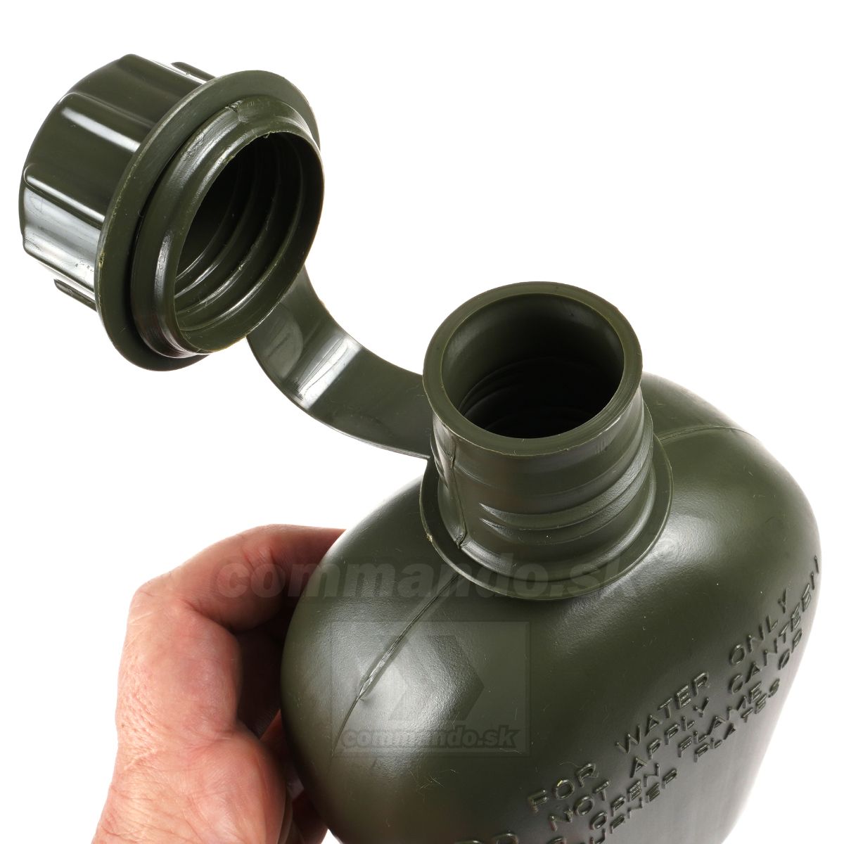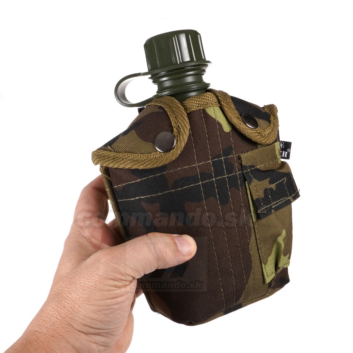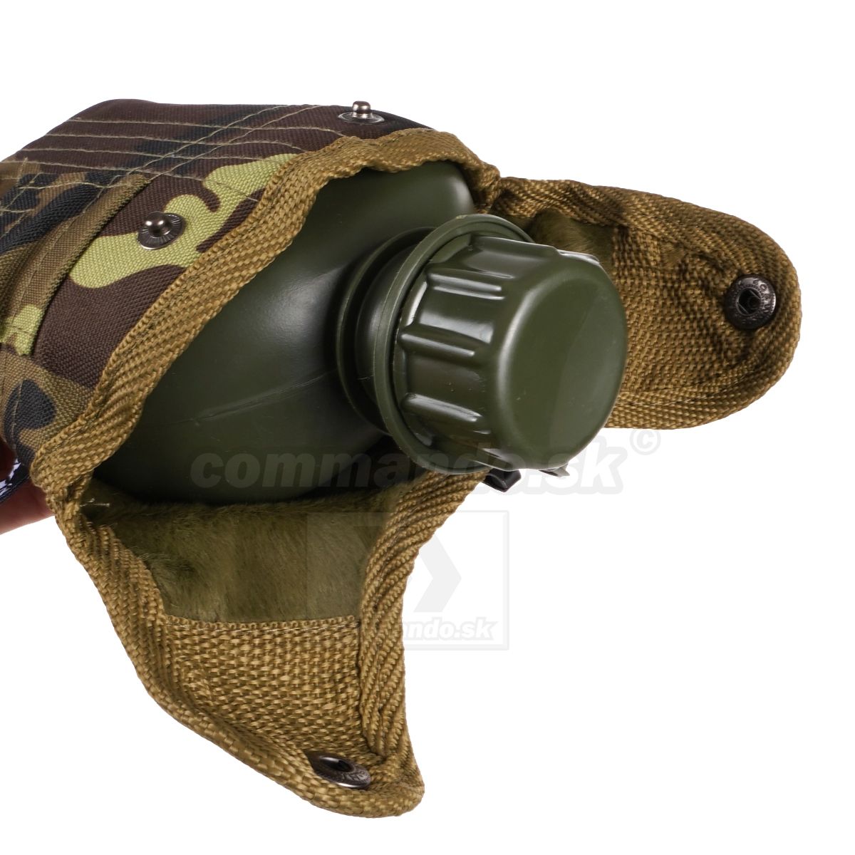 Praktická US plastová poľná fľaša. Poťah zapnutý pomocou patentných gombíkov, s bočnou kapsičkou a dvoma sponami na upevnenie k opasku alebo k plecniaku. Vhodná do prírody, pre poľovníkov alebo len tak, na turistiku a voľný čas.