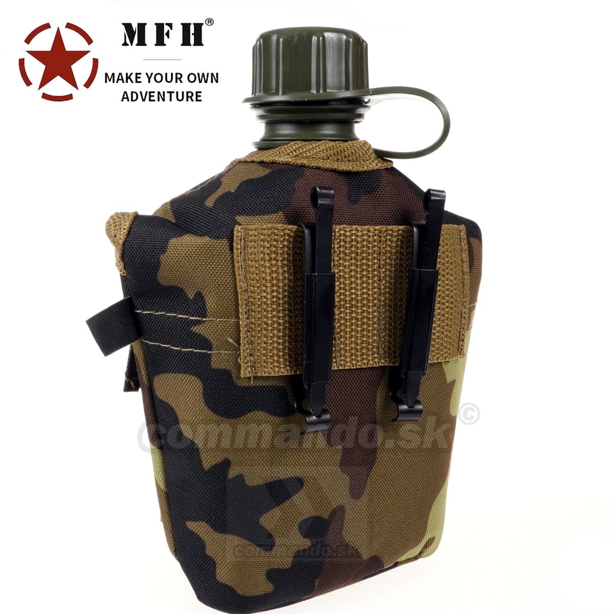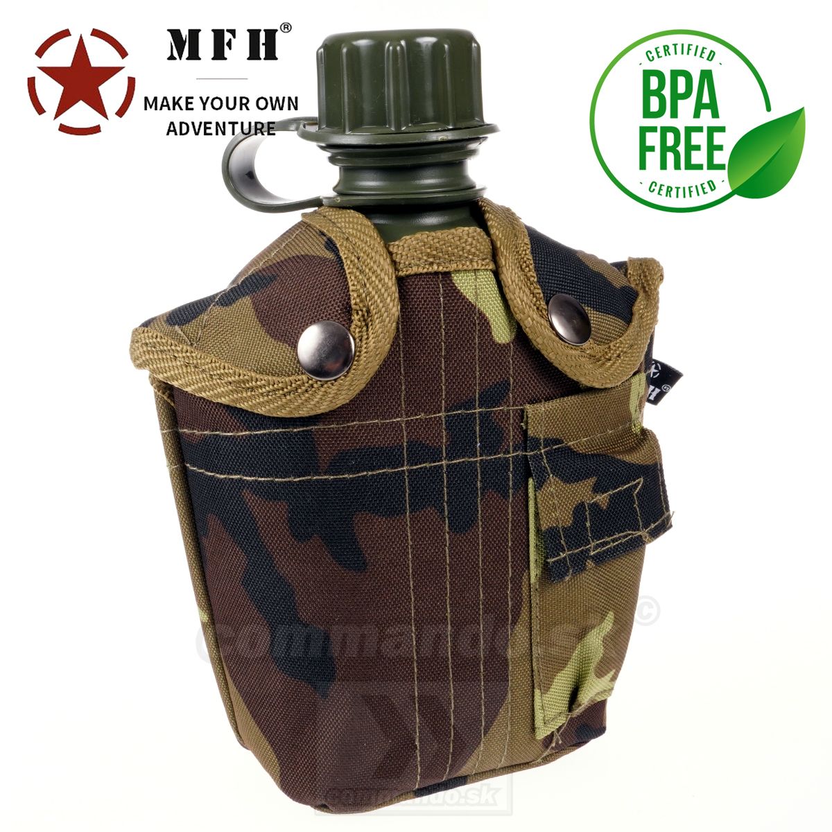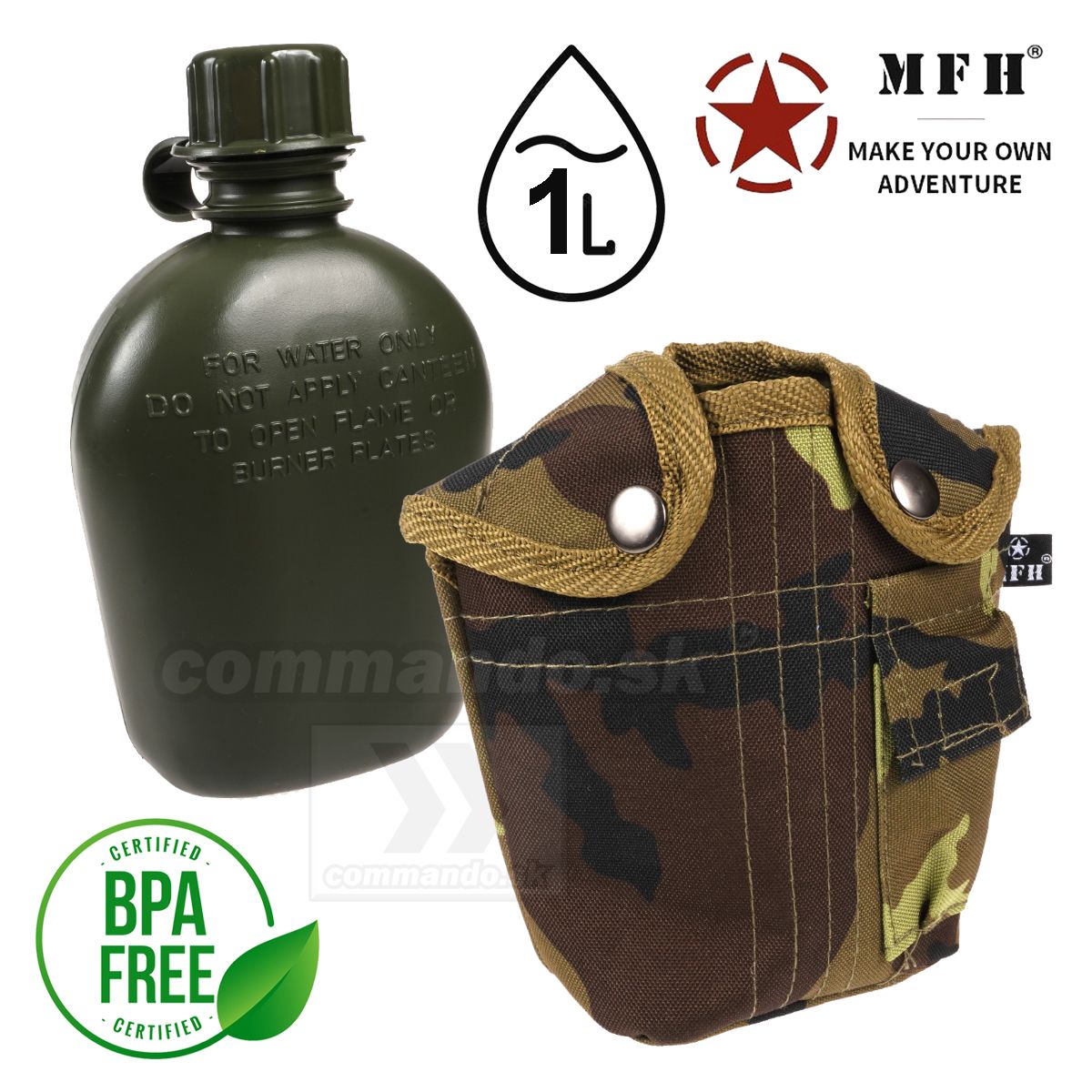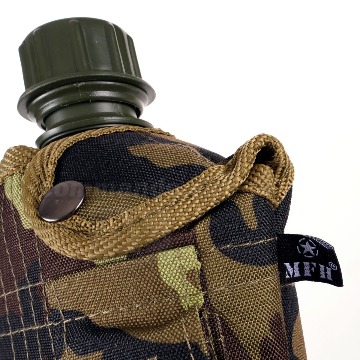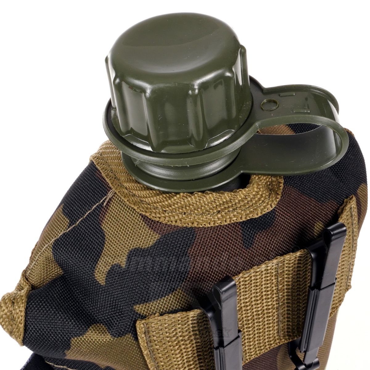 Praktická US plastová poľná fľaša. Poťah zapnutý pomocou patentných gombíkov, s bočnou kapsičkou a dvoma sponami na upevnenie k opasku alebo k plecniaku. Vhodná do prírody, pre poľovníkov alebo len tak, na turistiku a voľný čas.