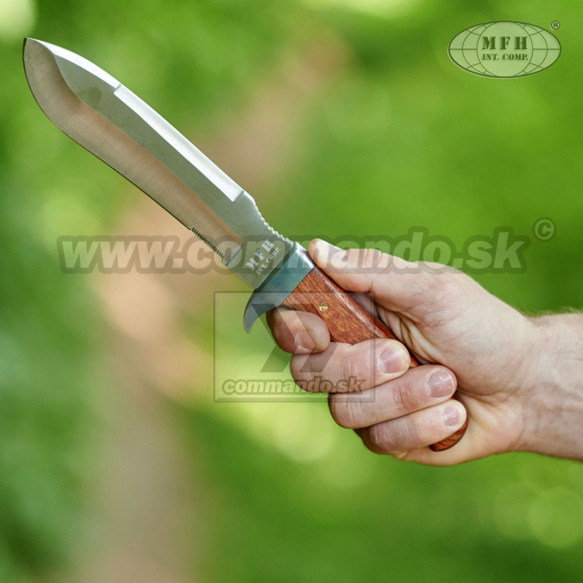 Zásahový nôž používaný výsadkom armády BW. Čepeľ z kvalitnej 3Cr13 Stahl ocele, prechádza celým nožom Full Tang. Nôž je vybavený aj spodnou záštitou na ukazovák proti šmyknutiu ruky a prípadnému zraneniu. Kožené puzdro s 5 cm okom na opasok a poistným ramienkom so zapínaním na patentný gombík. Drevená rúčka na konci s mosadzným okom na prevlečenie šnúrky,dodáva nožu skutočne veľmi elegantny vzhľad. Vrchná - zadná časť čepele má vrúbkované vybratie pre dokonalý prítlak palcom, a tým lepšiu prácu napríklad pri rezaní tvrdších materiálov. Nôž je vyborná voľba pre akékoľvek lovecké, rybárske a iné outdoorové aktivity.