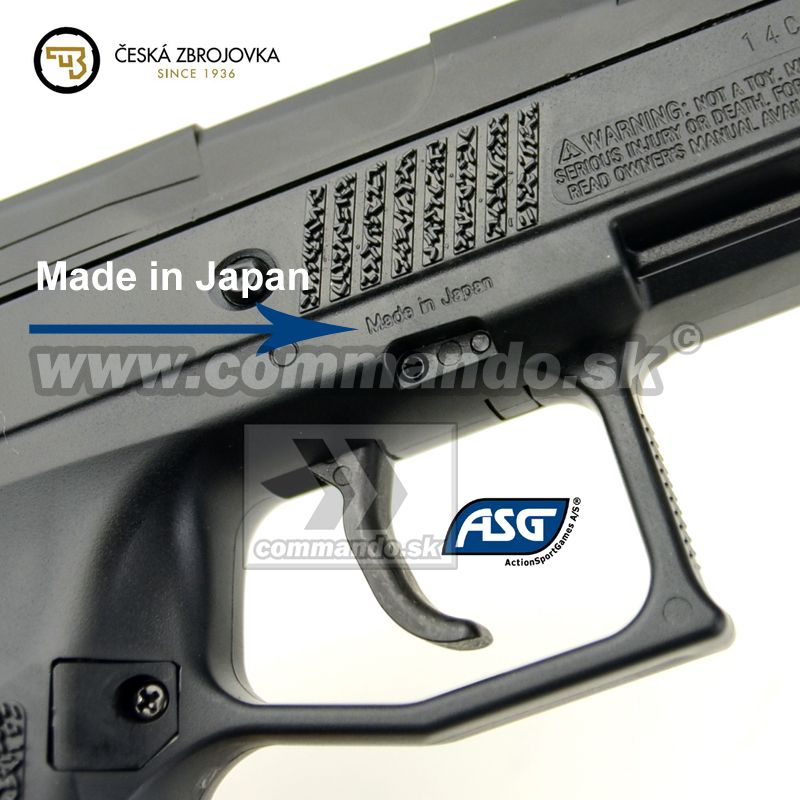 Perfektne prepracovaná replika. Každý detail je dotiahnutý do konca, viď. priložené foto. Autentická replika známej "krátkej" zbrane značky CZ model P-09 Duty. Telo je plastové a niektoré vonkajšie a vnútorné časti sú kovové, presne podľa originálu. Na tele sú autentické označenia zbrane. Zbraň fičí na stlačený plyn z malej CO2 bombičky, ktorá sa vkladá do pažby pištole. Hlaveň je s vývrtom, čím sa zabezpečuje vyššia presnosť. Zásobník je obojstranný ktorý sa vkladá zo spodu do pažby. Výrobok je Made In Japan, čo zrejme je dobré, hlavne po kvalitatívnej stránke.