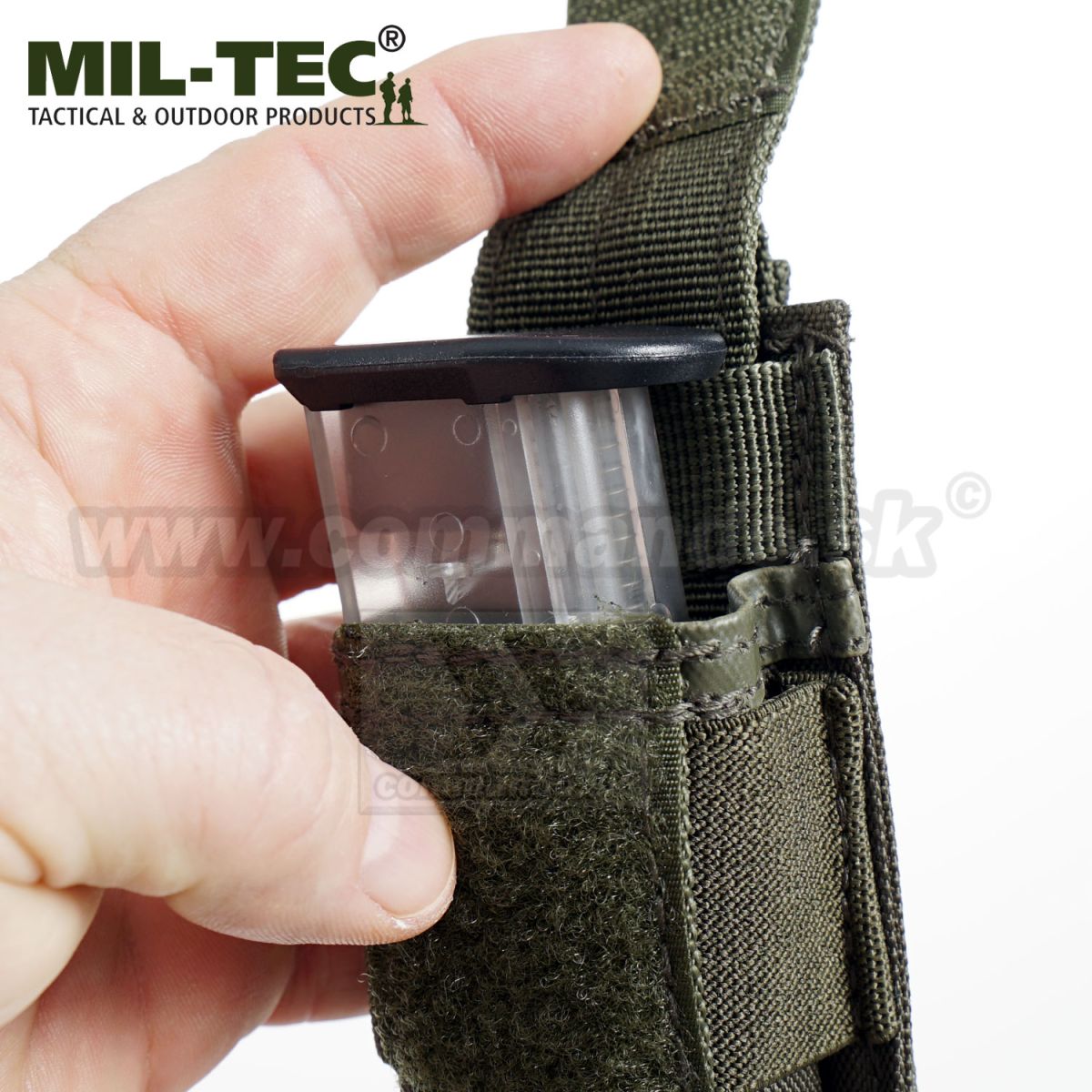 Upevňovacie pútko na opasok o šírke 2,5cm je na patentný gombík. Uchytiť sa dá klasicky na Molle systém alebo na opasok do šírky 4,5cm. Prekrytie puzdra je na suchý zips, ktorý je našitý na prednej strane. Do puzdra sa dajú dať zásobníky rôznych dĺžok, nakoľko sa dá zapínací popruh výškovo nastaviť. Cez puzdro ide gumový pás takže sa puzdro dokonale prispôsobí hrúbke zásobníka alebo inému predmetu.