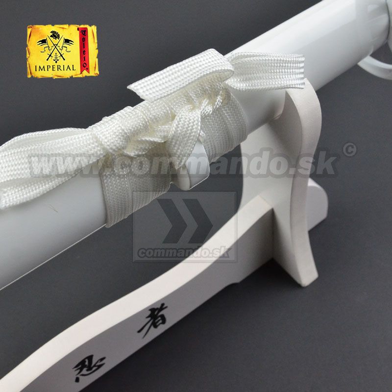 Samurai Katana White Ninja - efektná ozdobná replika japonského meča s lesklou bielou povrchovou. Biely stojan taktiež s bielou úppravou s japonskými znakmi. Je vidieť že biela módna farba dorazila aj medzi chladné zbrane.