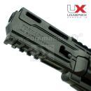 Ako každá vecička na strieľanie aj táto musí mať bezpečnostnú poistku, ktorá je tesne pri kohútiku. Spodná aj vrchná RIS lišta rozmeru 21/22 mm čo je podľa amerického štandardu. Kto počíta menší rozmer tak uvádza 21mm a kto väčší rozmer tak uvádza 22mm. Takže 21 mm a 22 mm je to to isté! Na túto lištu si môžte pripevniť všetko možné aj nemožné. Laserový zameriavač či nejaký kompaktný kolimátor vám spríjemní radosť zo streľby. Zásobník je na 10 brokov a vkladá sa do valca (viď. priložené foto) a...... môže sa páliť!! Čiže celkovo 3 x 10 brokov pripravených na paľbu.
