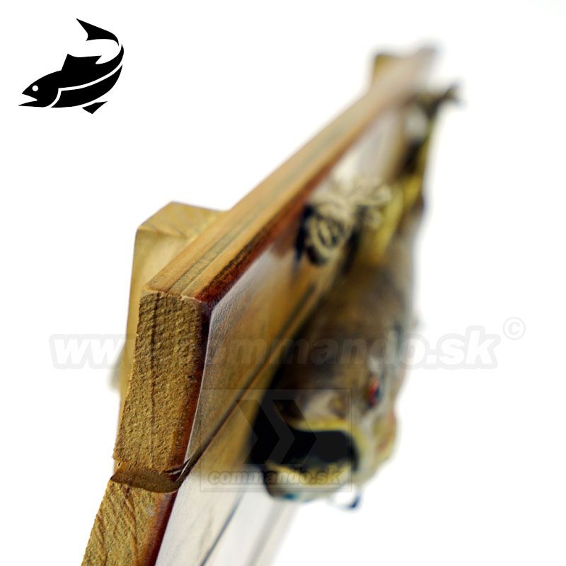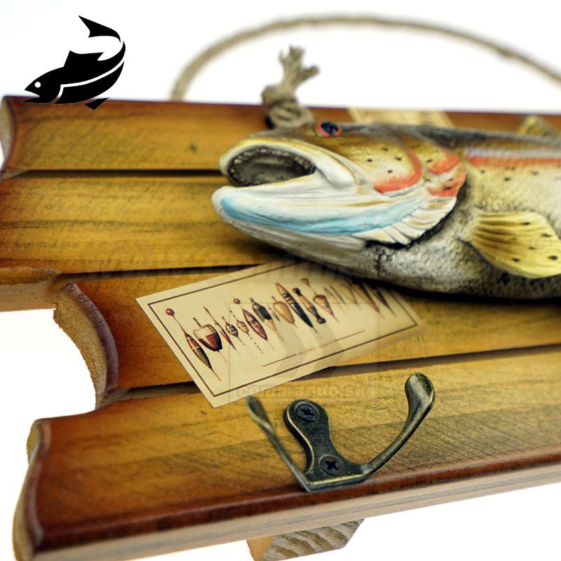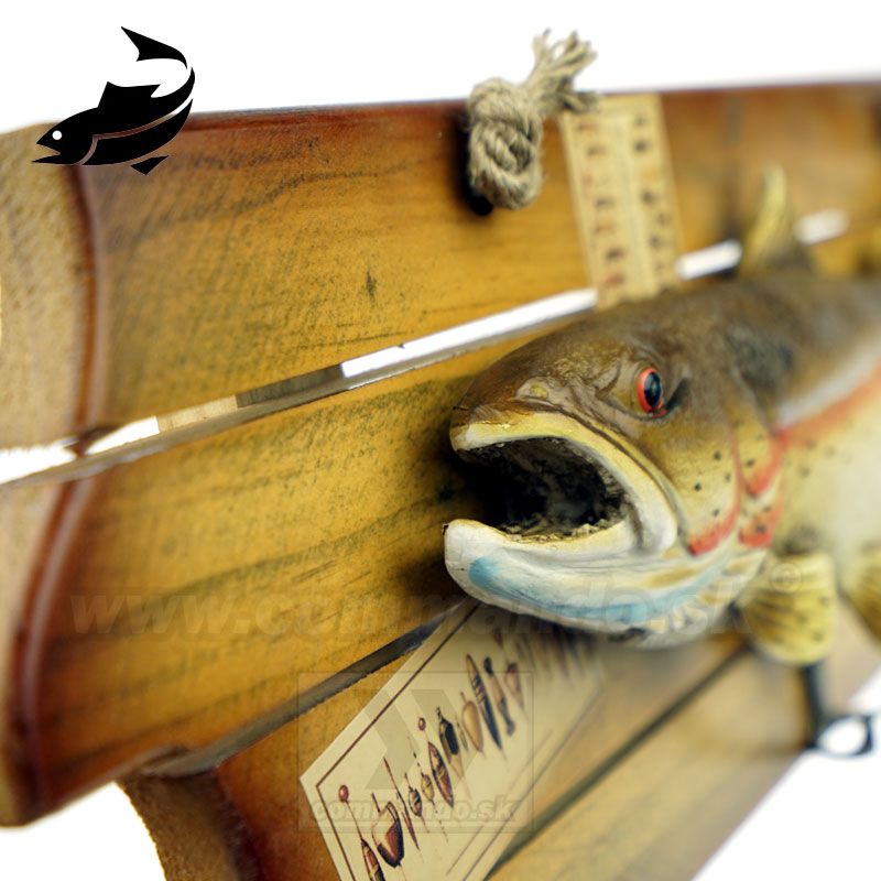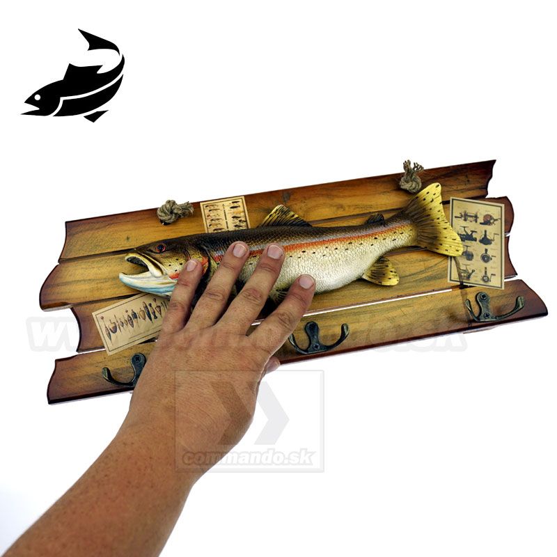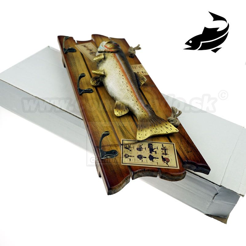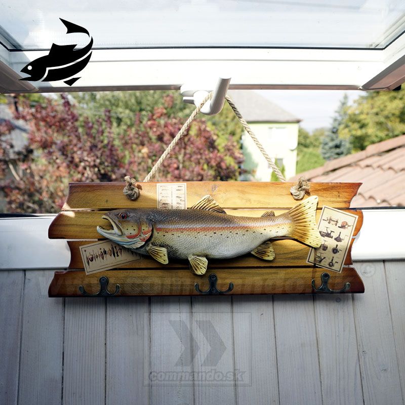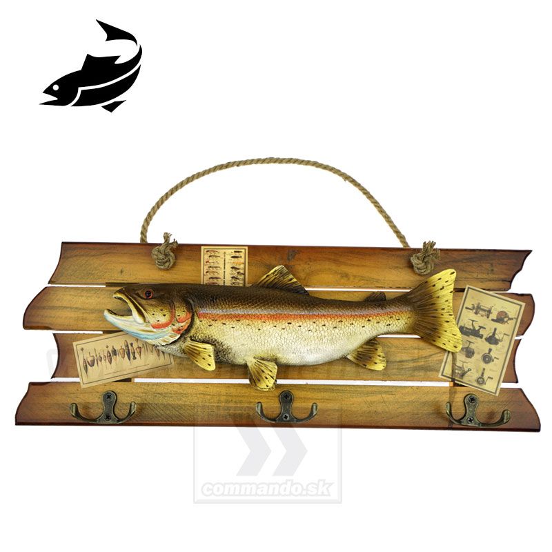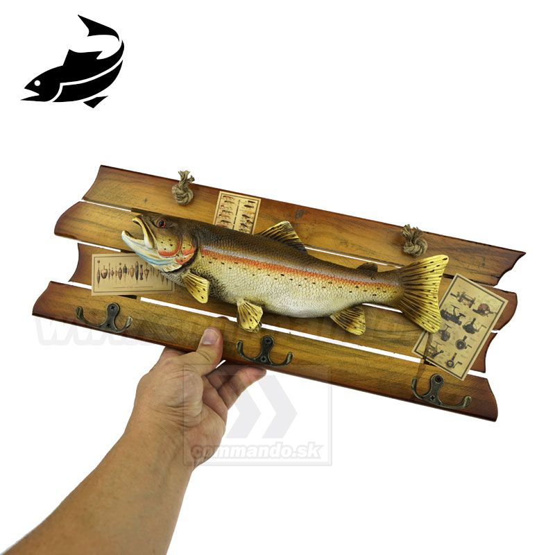 Efektný drevený vešiak na stenu s motívom našej ryby. Pstruh asi jedna z naj sladkovodných rýb v našej zemepisnej šírke. Materiál vešiaka je upravené pravé drevo. Tri vešiačiky na zavesenie kabátov sú kovové. Ostriež je asi z plastu, alebo z nejakého moduritu, ručne domaľovaný. Vešiak sa vešia pomocou prírodného povrazu.
