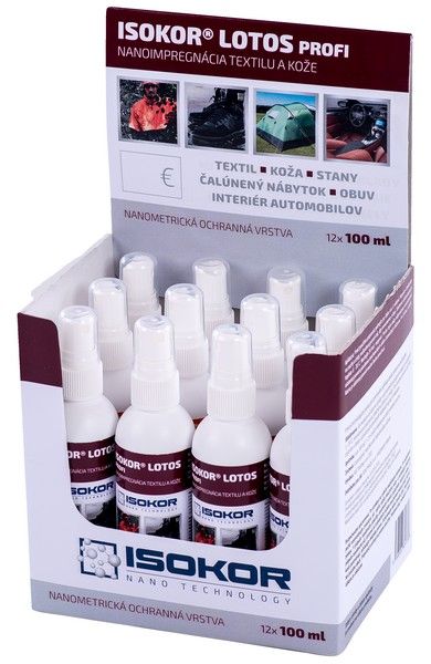 Technológia inšpirovaná prírodou. Isokor Lotos PROFI je hydrofóbny impregnačný "nástrek" na povrchové ošetrenie všetkých druhov textilu z prírodných aj umelých vlákien. Vhodné na rôzne odevy, plátené topánky, stanové prístrešky, prírodné, umelé kože a podobne. Prípravok zabraňuje prenikaniu vlhkosti a nadmernému znečisteniu. Impregnácia zaručuje príjemný pohyb v suchom odeve ošetrenom týmto prípravkom, najmä počas dažďa a vo vlhkom resp. chladnom prostredí.